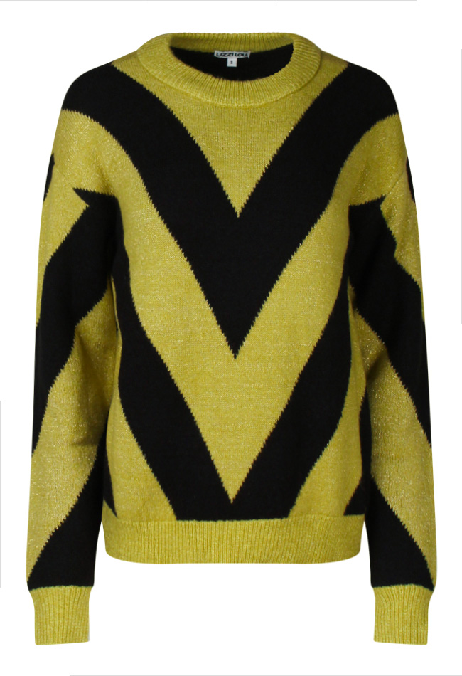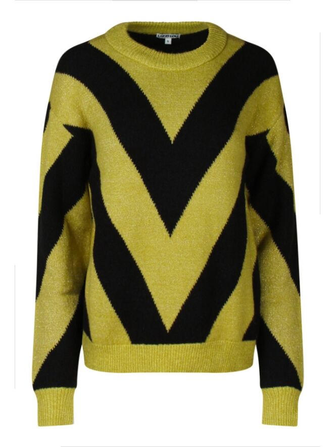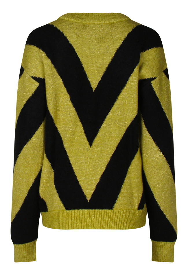 Fijn gebreide trui in sweater model met strepen patroon in V vorm. In het banen patroon zit een glitterdraad verweven voor een shiny effect. Deze trui is lekker zacht!