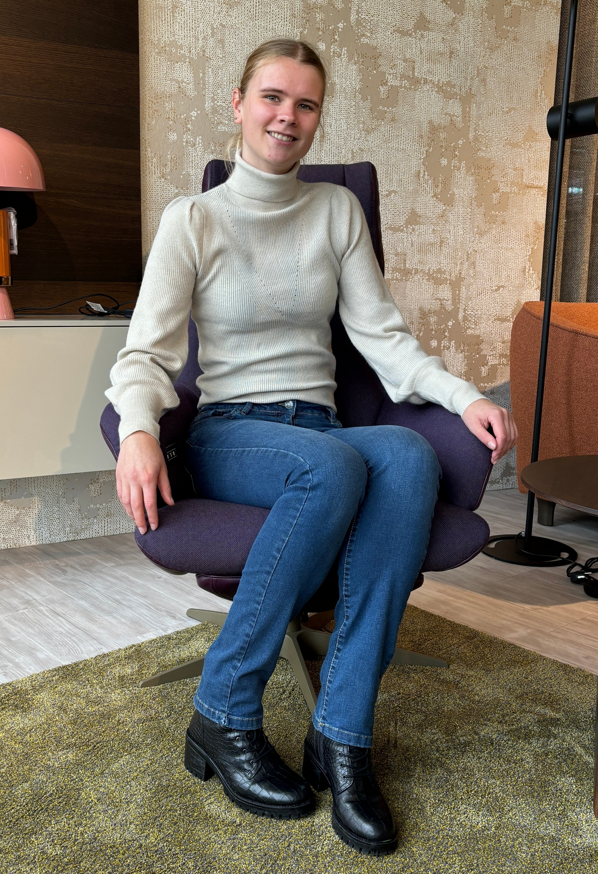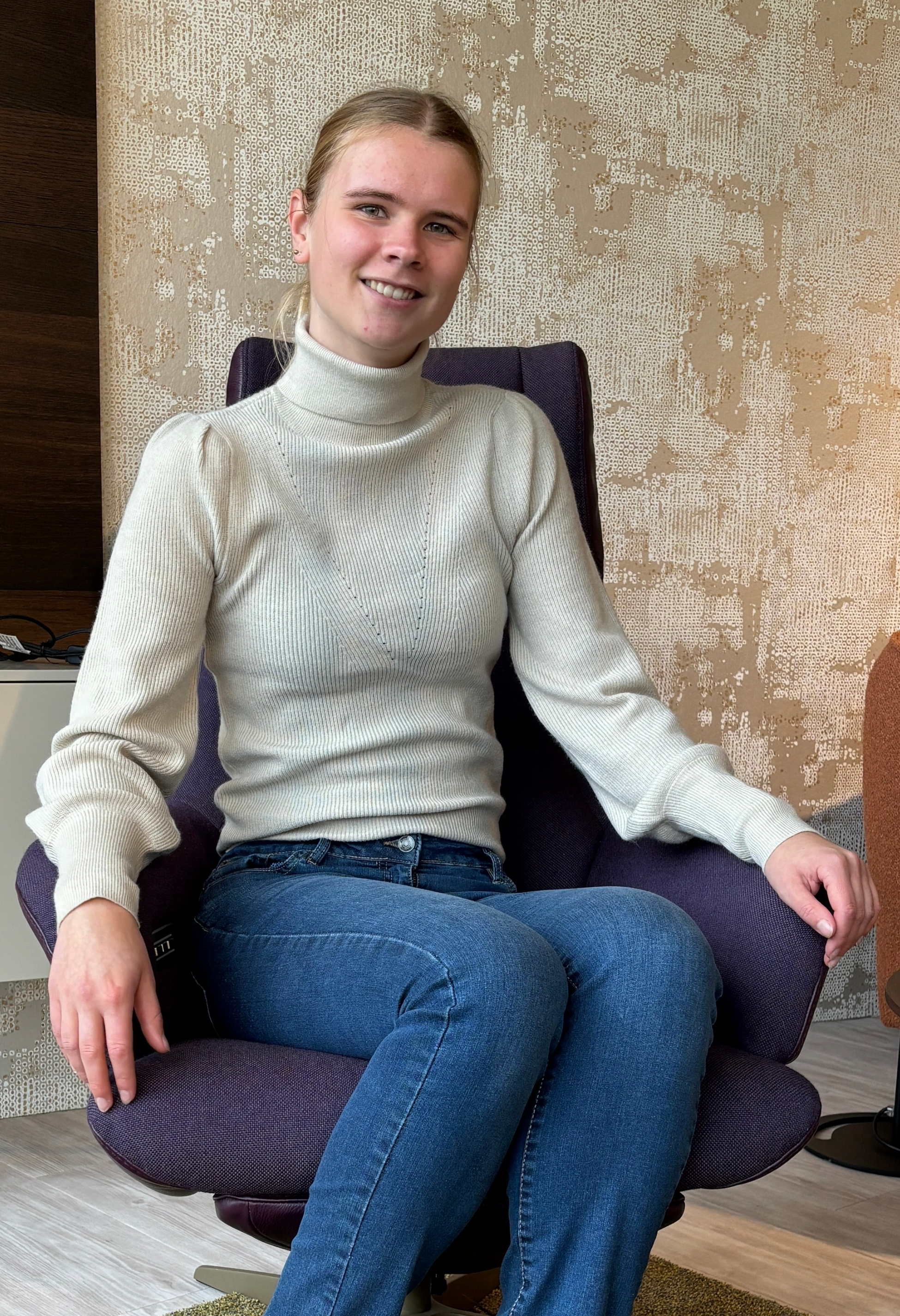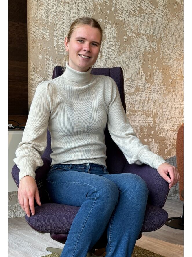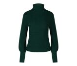 Deze trui is een pullover model met warme rolcoll. De trui heeft een klein pofmouwtje, lange manchetten en voorop zit een ingebreide subtiele V in dezelfde kleur.