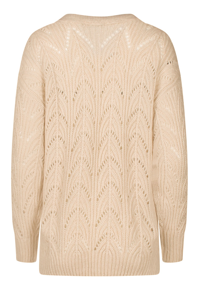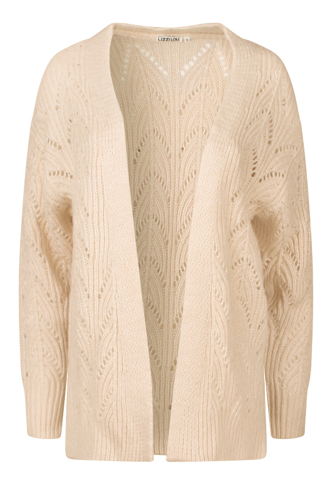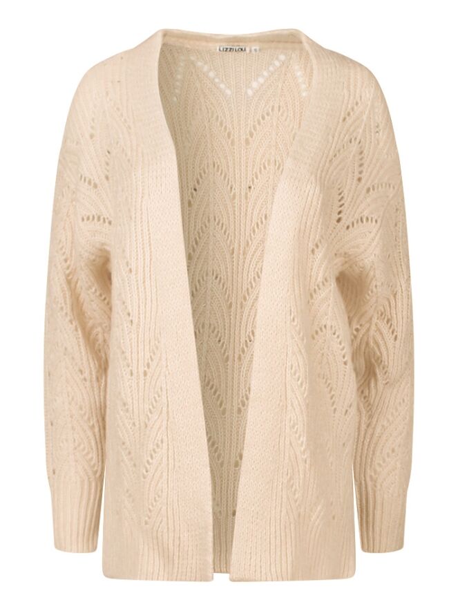 Dit open vest van Lizzy Lou is een wat wijder model en gemaakt van een open ajour breisel. Je draagt het makkelijk over een hemdje, T-shirt of top. De lengte van dit vest valt op de heup.