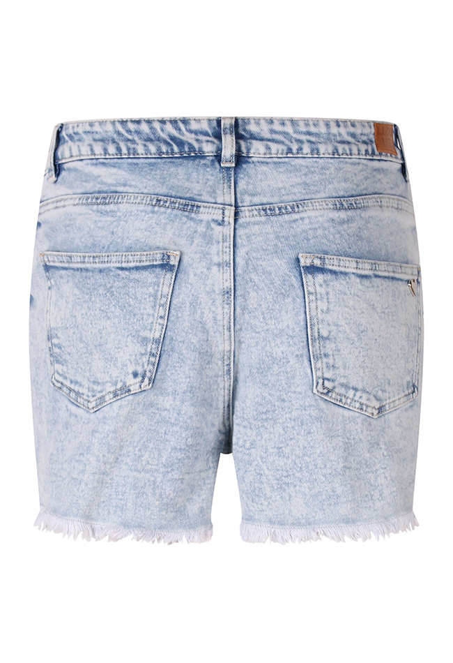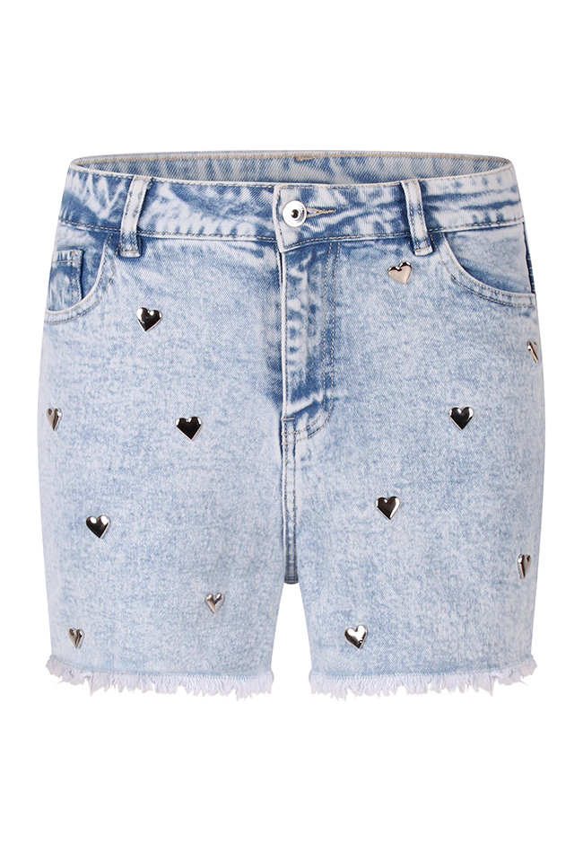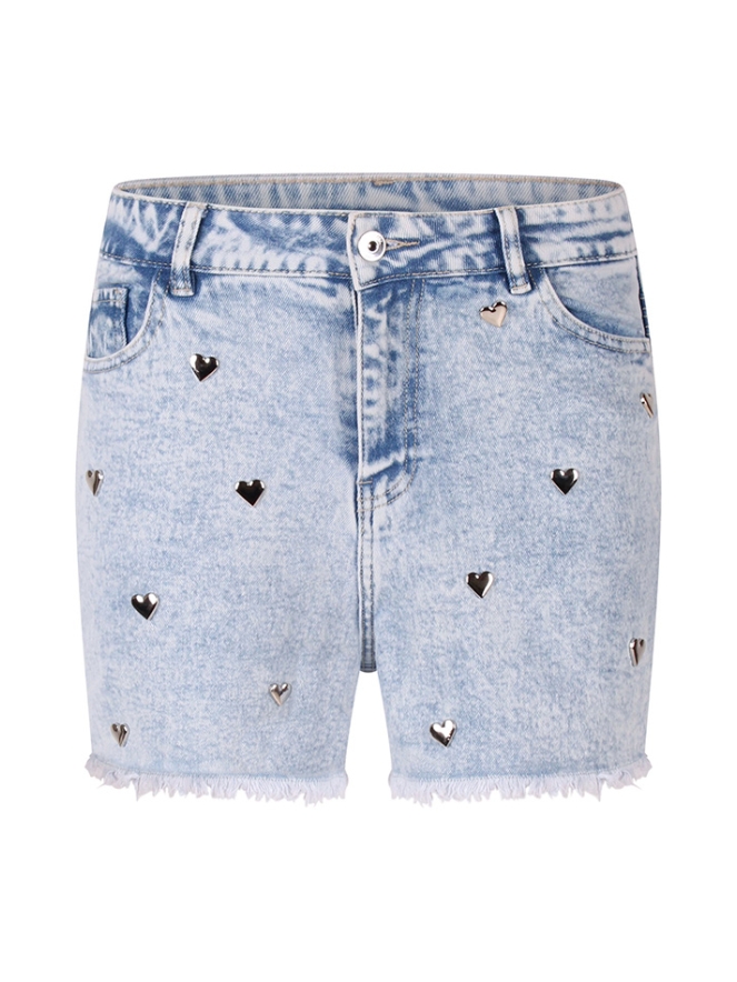 Voeg een speelse twist toe aan je zomergarderobe met deze stijlvolle high-waist denim korte broek voor dames. Voorzien van schattige hartjesstuds op de voorkant, straalt deze broek een vrouwelijke en trendy vibe uit. De licht gerafelde zoom geeft een casual, nonchalante uitstraling, perfect voor warme dagen en festivals. Combineer met een topje en sneakers voor een moeiteloze, modieuze look.