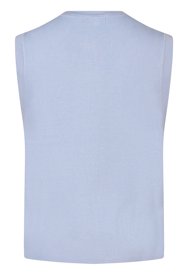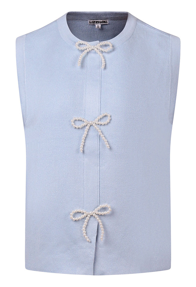 Dames gilet met een ronde kraag, mouwloos model. Afgewerkt met mooie strikparels voor een elegante en verfijnde uitstraling.