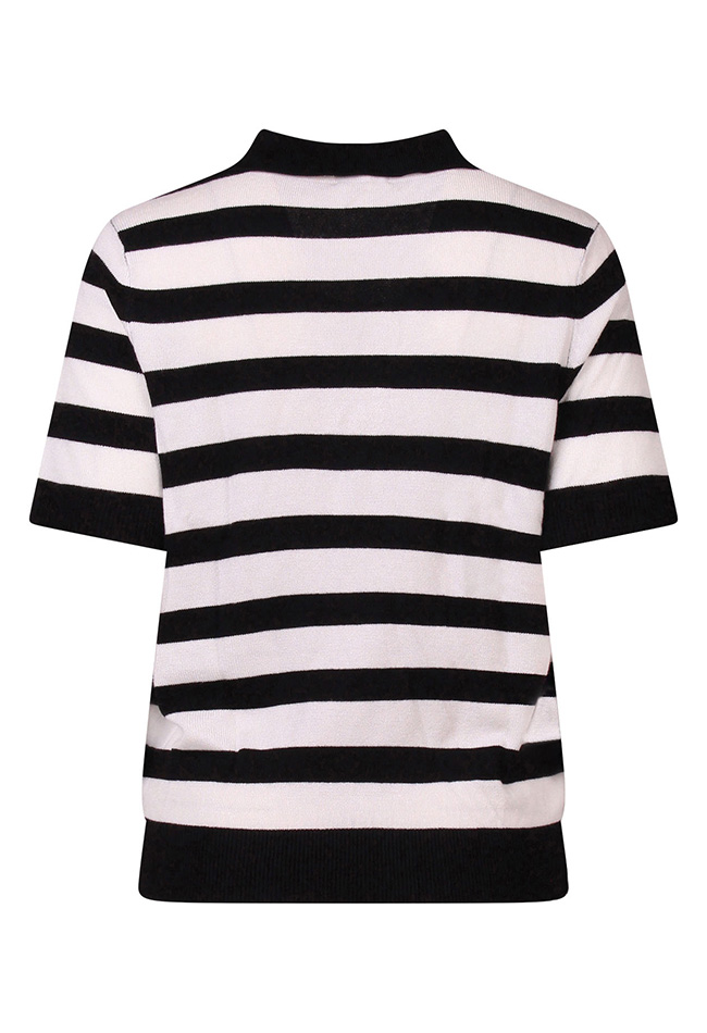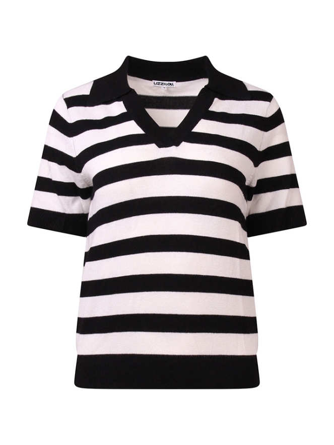 Damestrui met korte mouwen, een V-hals en mooi polokraagje. Uitgevoerd met een stijlvol streeppatroon voor een frisse en modieuze uitstraling.