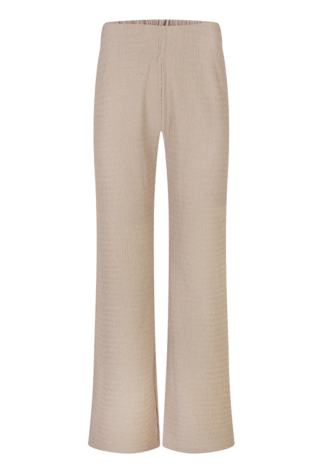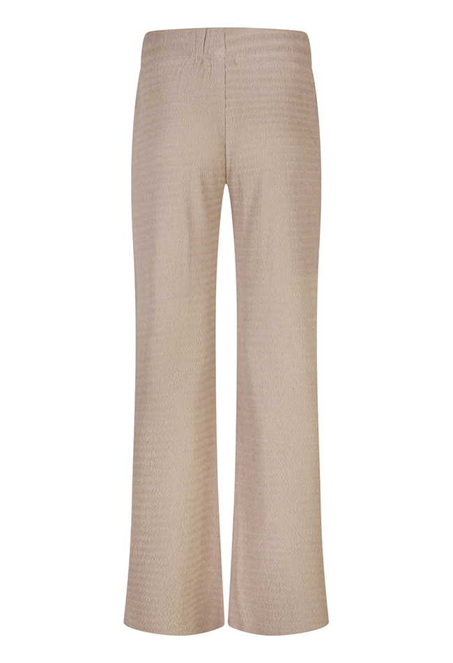 Dames pantalon met een subtiele structuur en een wijde pijp voor een moderne, elegante look. Voorzien van een elastische taille voor extra comfort en een fijne pasvorm.
