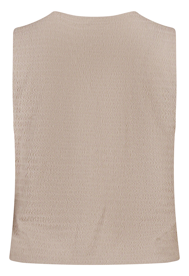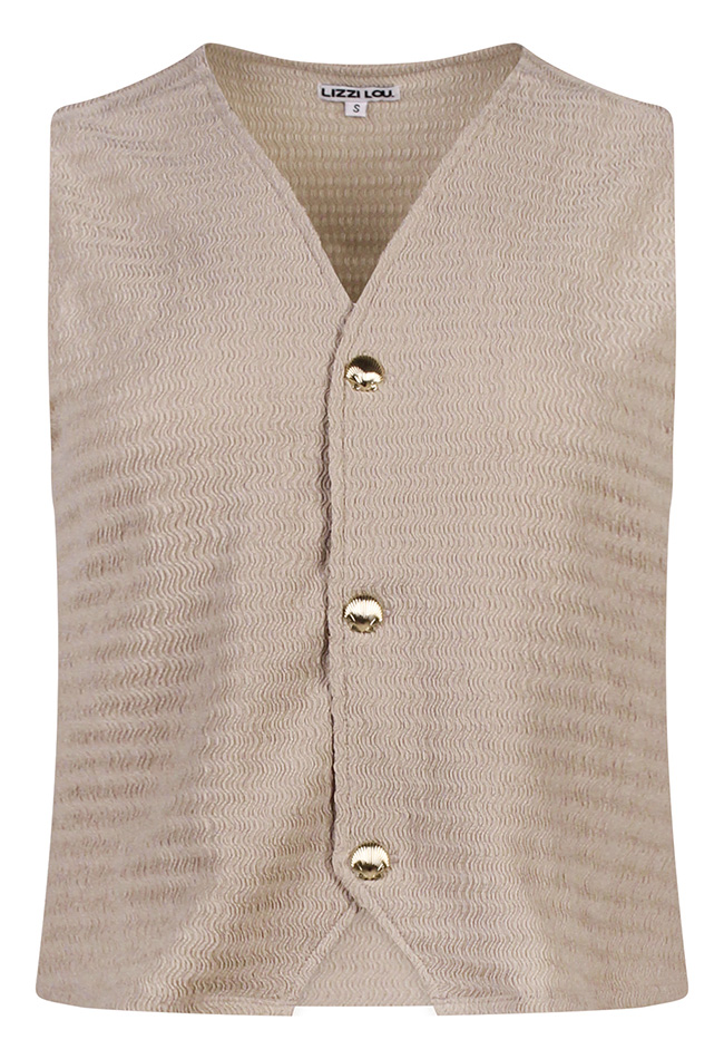 Damesgilet met structuur, een V-hals en mouwloos ontwerp. Afgewerkt met elegante schelpknoopjes voor een verfijnde en stijlvolle uitstraling