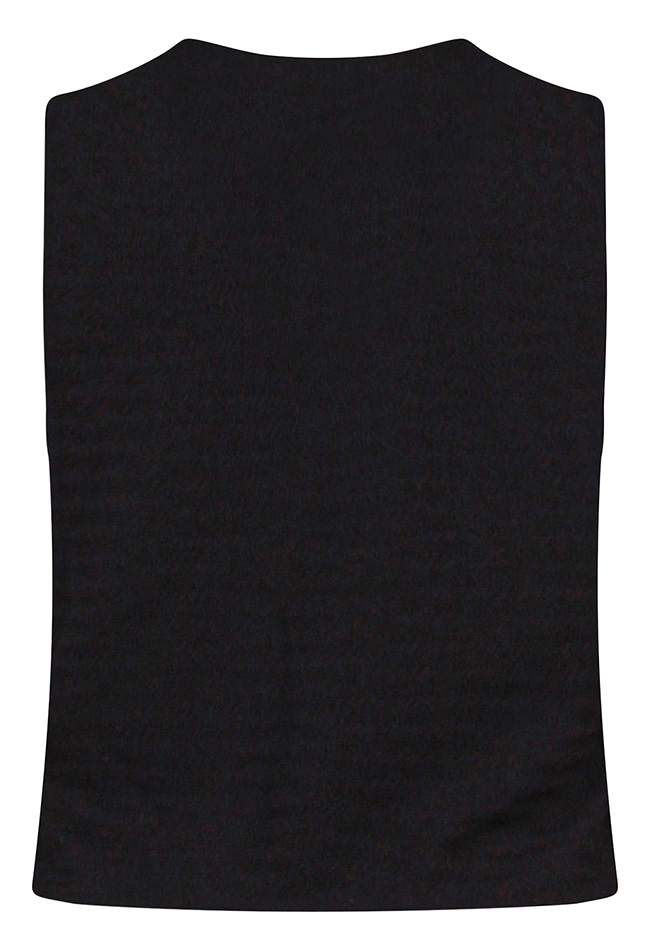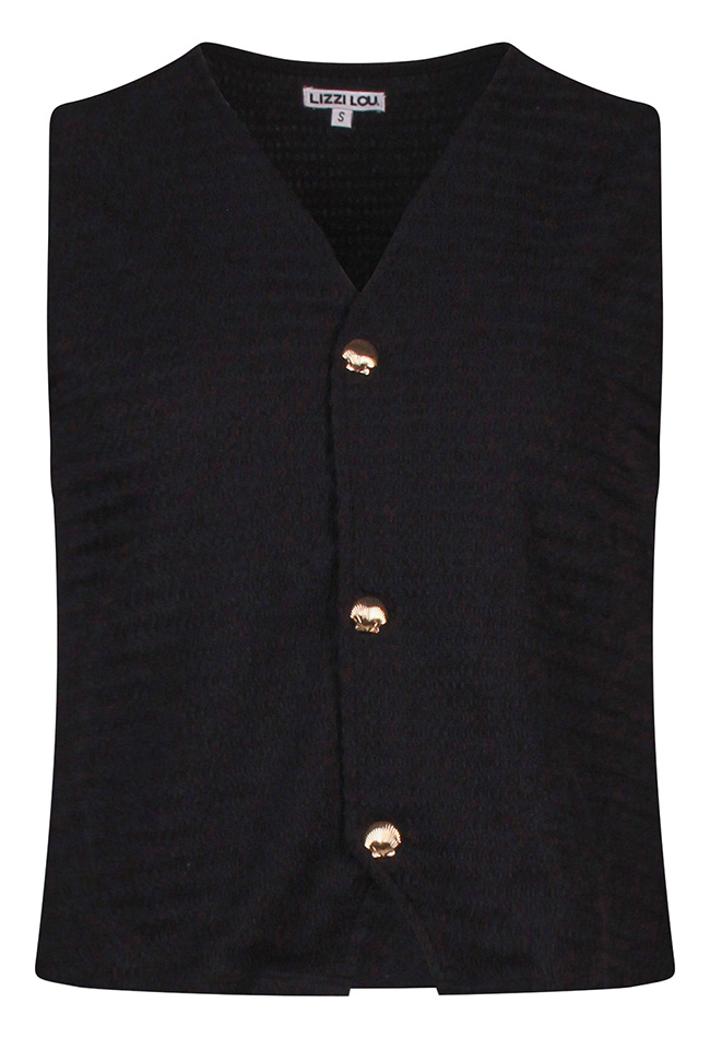 Damesgilet met structuur, een V-hals en mouwloos ontwerp. Afgewerkt met elegante schelpknoopjes voor een verfijnde en stijlvolle uitstraling