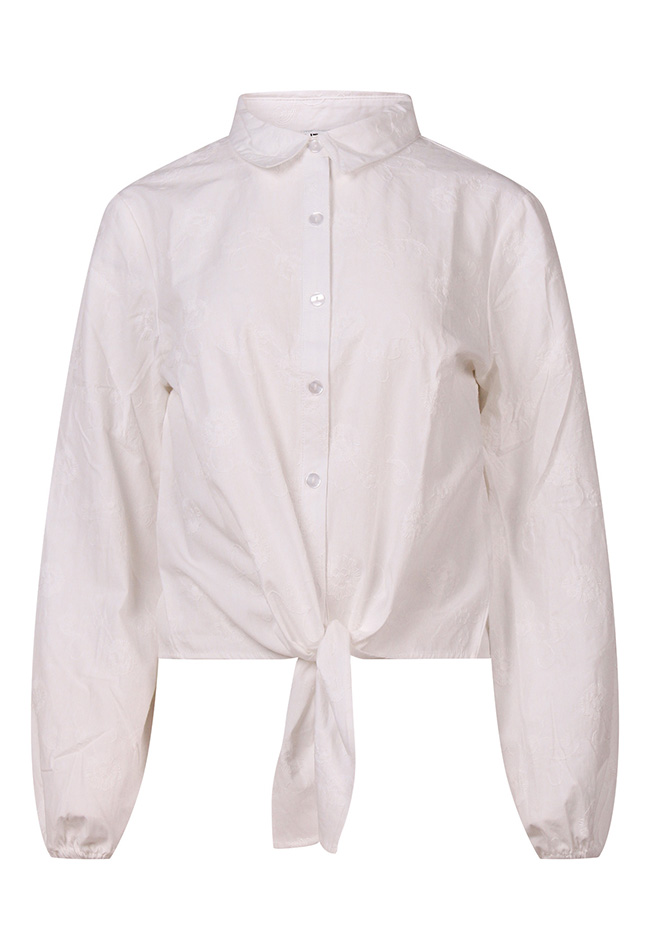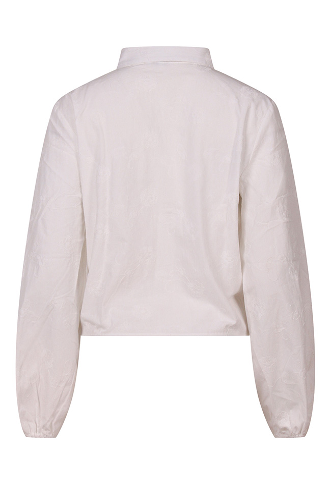 Dit leukerdje is een 100% katoenen knoopblouse. De blousjes met streep hebben opgestikte pareltjes. Het witte blousje heeft geen pareltjes maar een allover geborduurde bloemenprint op de stof. Alle bloesjes hebben een elastiekje aan het uiteinde van de mouw.