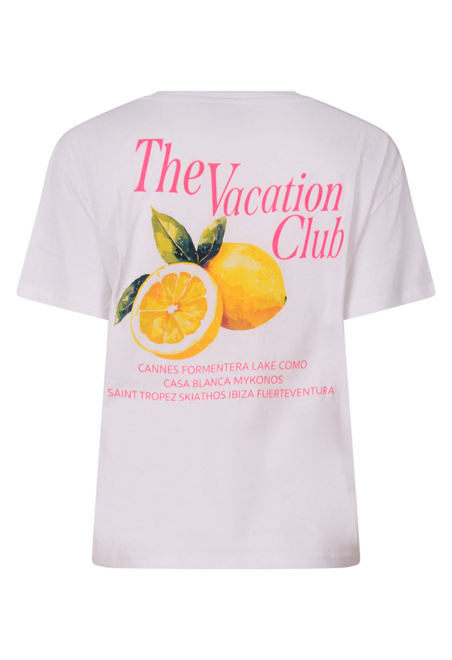 Voel de zomer vibes met dit stijlvolle T-shirt van The Vacation Club. Het shirt is uitgevoerd in levendige, zomerse kleuren en krijgt een speelse twist door de opvallende citroenprint. Perfect voor zonnige dagen, stranduitstapjes of een casual citylook. Gemaakt van zachte, ademende stof voor maximaal comfort, zodat jij de hele dag fris en relaxed blijft. Combineer met shorts, jeans of een luchtige rok voor een vrolijke, zomerse outfit.