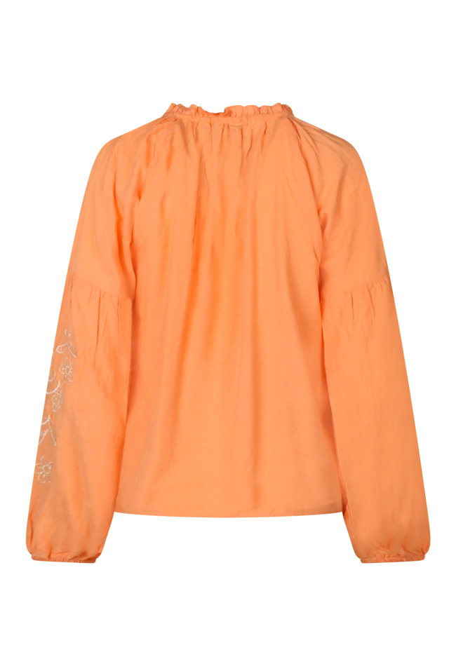 Deze ruimvallende top met ballonmouwen heeft een bloem borduursel op beide mouwen. Rond de kraag zit een ruche rand en voor bij de hals een uitsparing met kwastjes. Dezelfde top is ook verkrijgbaar voor meisjes met art.nr. Z80267