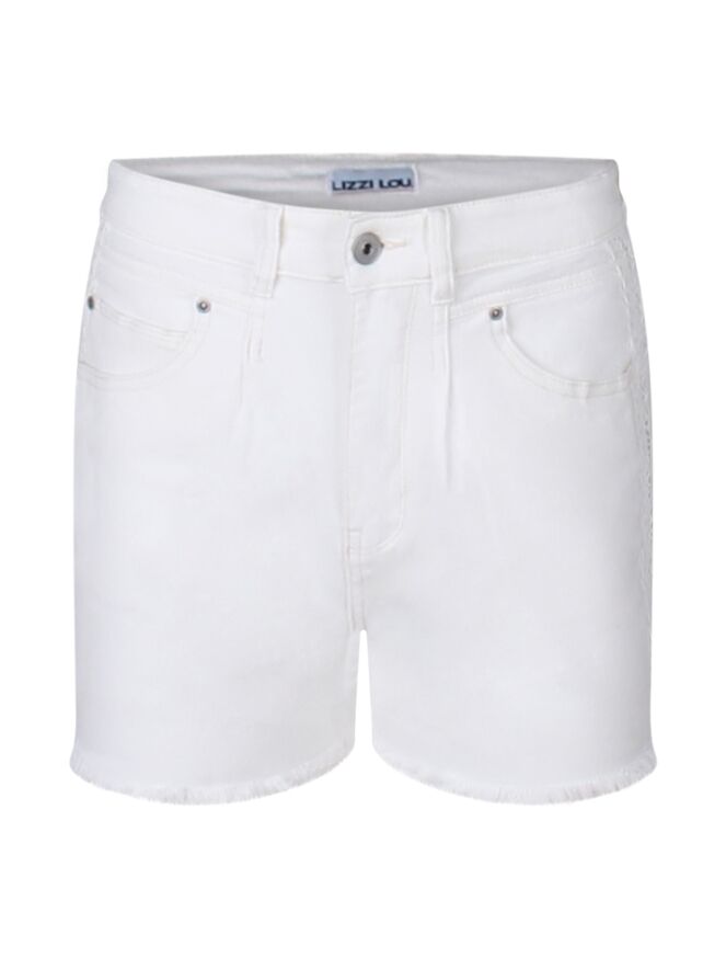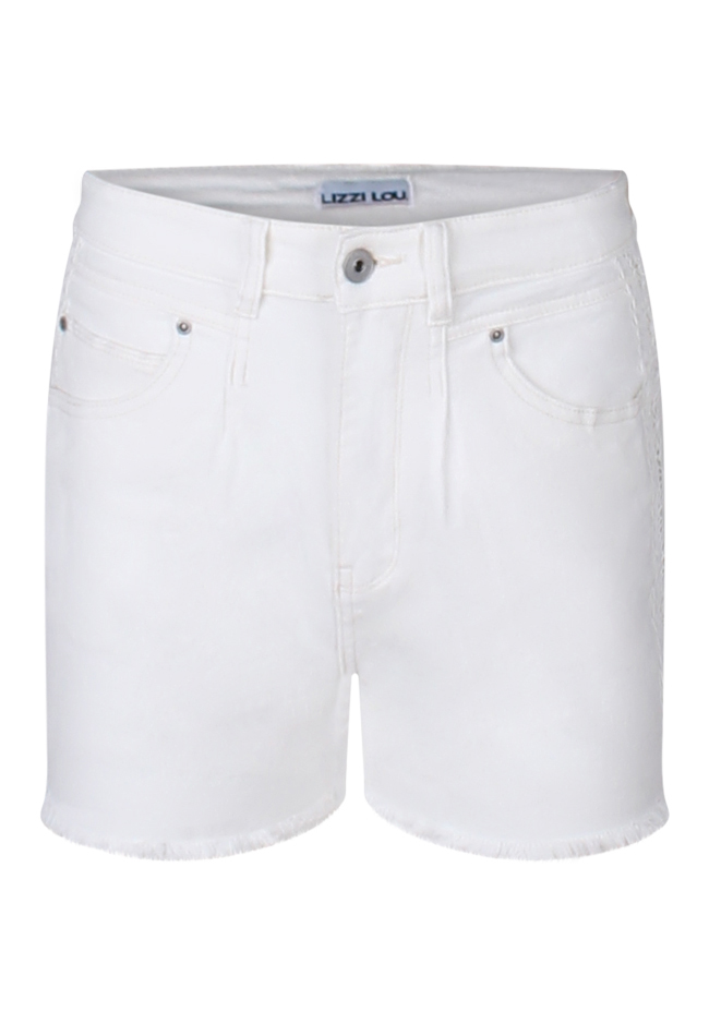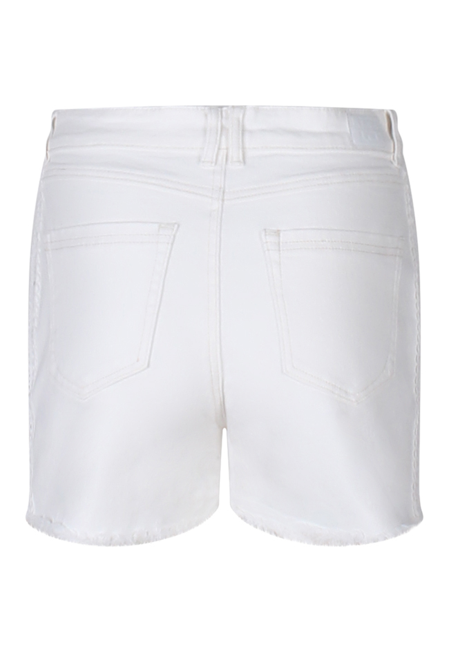 Deze trendy denim short voor dames heeft een high waist en is afgewerkt met stijlvolle lace tape en rafeltjes voor een speelse, vrouwelijke touch. Perfect voor een casual zomerse look met een beetje extra flair. Draag de short in de zomer naar een festival of bij een gezellig uitje.