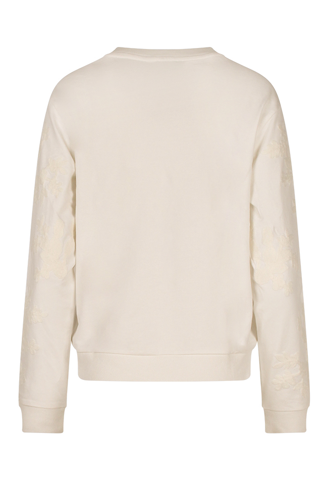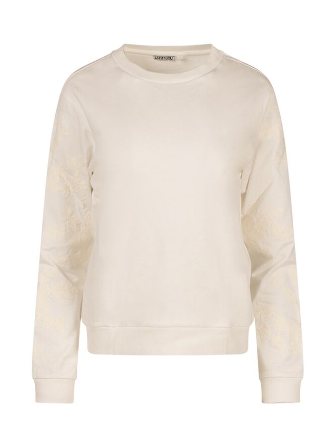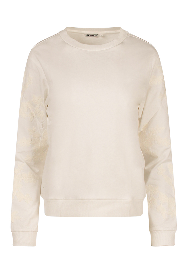 Deze effen sweater van Lizzy Lou heeft in exact dezelfde kleur een bloemen reliëf op de mouwen. Verder een basic model. Leuk te combineren op jeans.