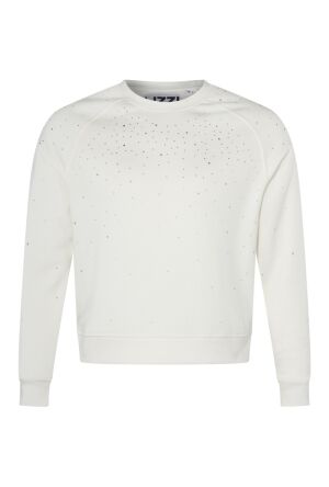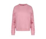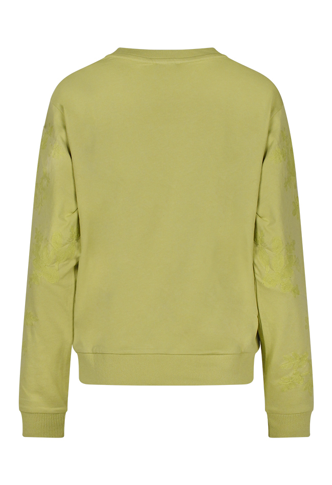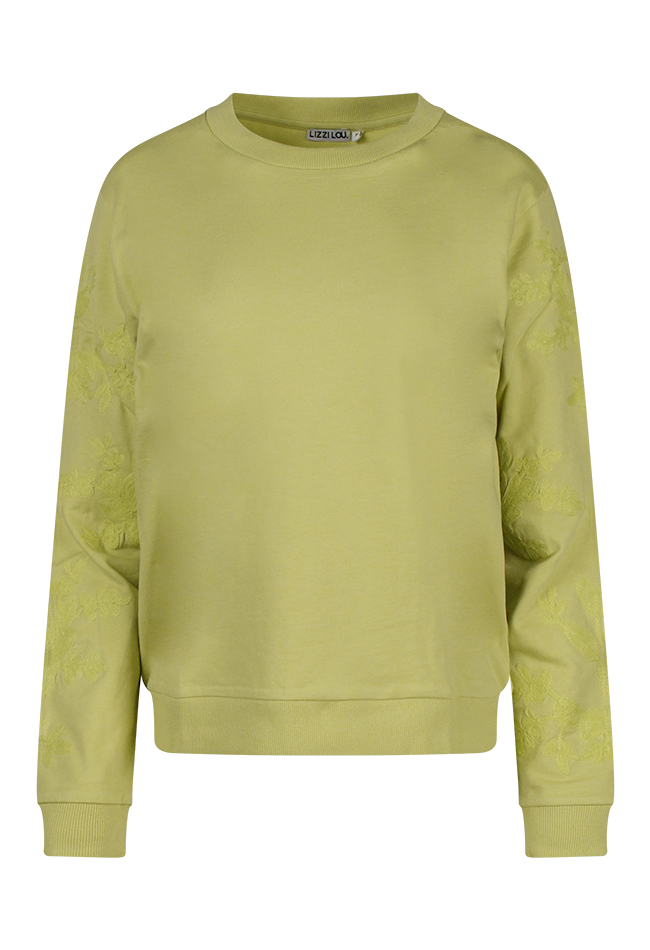 Deze effen sweater van Lizzy Lou heeft in exact dezelfde kleur een bloemen reliëf op de mouwen. Verder een basic model. Leuk te combineren op jeans.