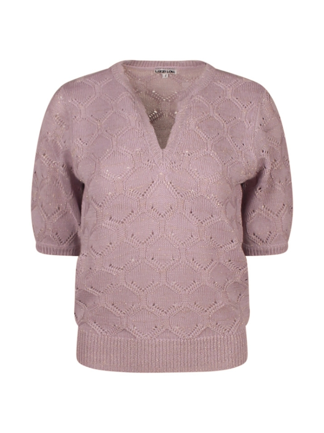 Shine baby shine! Mooie dunne trui met ingehaakt honinggraat patroon. De trui heeft een V hals inkeping met golvende afwerking. Door de gehele trui is een subtiel glittertje verweven.