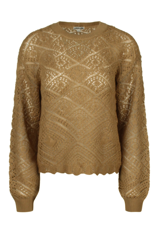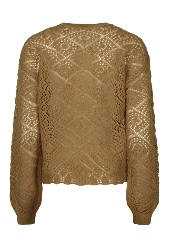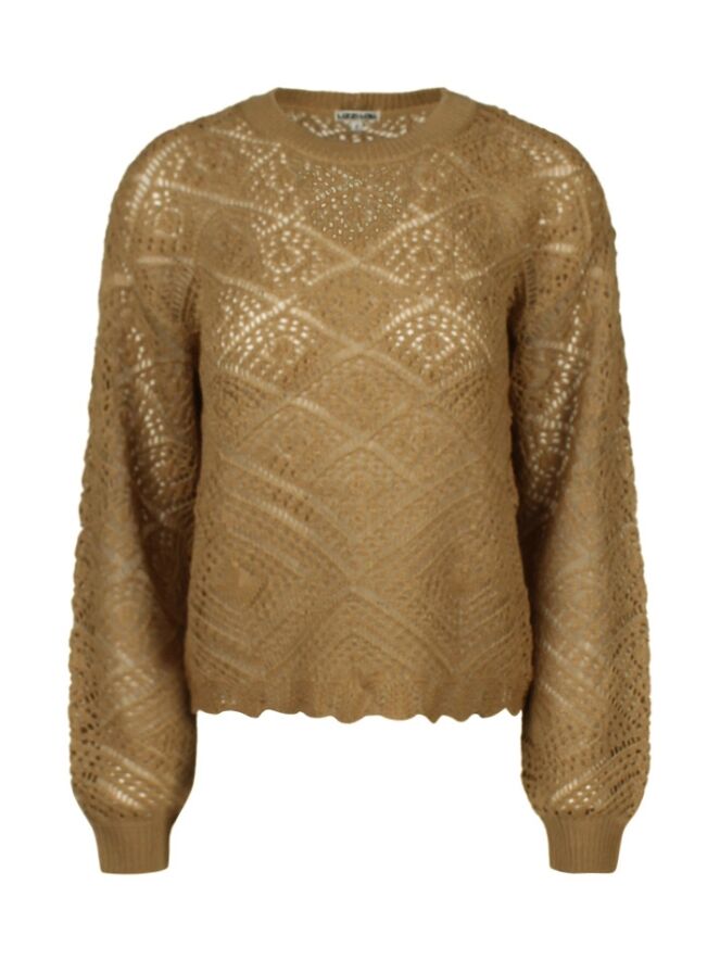 Zomerse trui met een open haakpatroon. Dus luchtig te dragen én doorzichtig. We adviseren dan ook om er een hemdje onder te dragen.