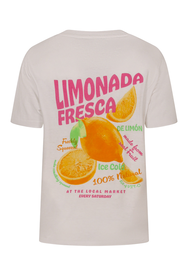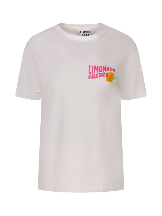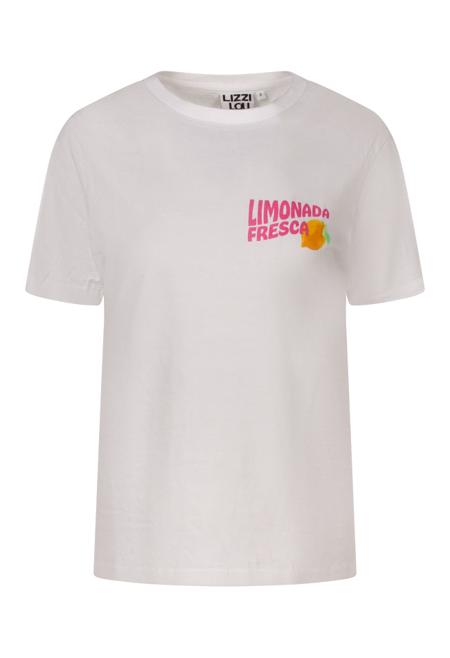Dit zomerse dames T-shirt van Lizzi Lou uit de 2025 collectie is gemaakt van 100% katoen en biedt ultiem comfort met een ronde hals en korte mouwen. De frisse ?Limonada fresca? print met citroenillustraties op de borst en rug geeft het shirt een speelse, vrolijke uitstraling. Ideaal voor zonnige dagen of feestelijke momenten, met een luchtige pasvorm en een levendige zomerlook.