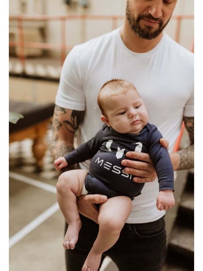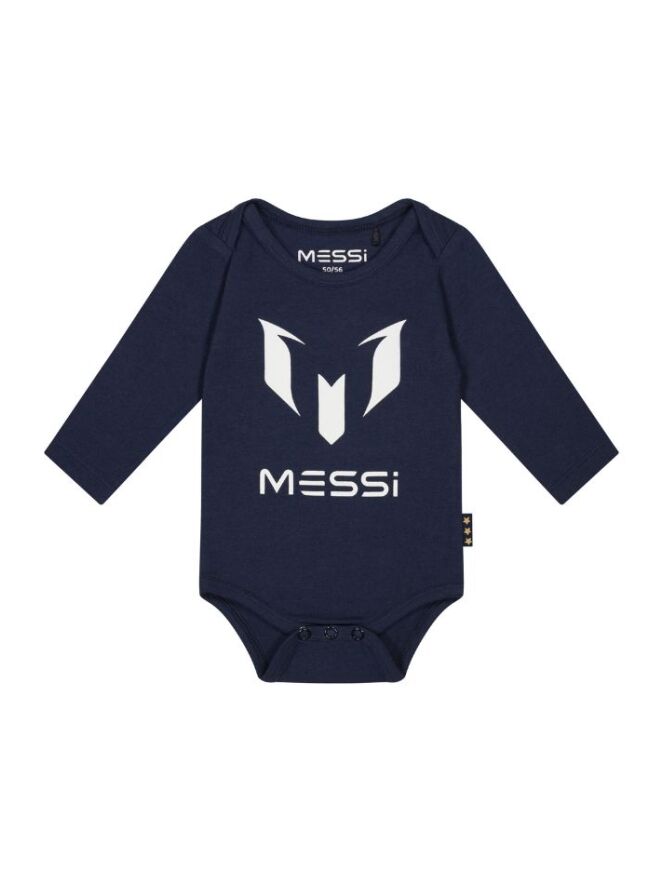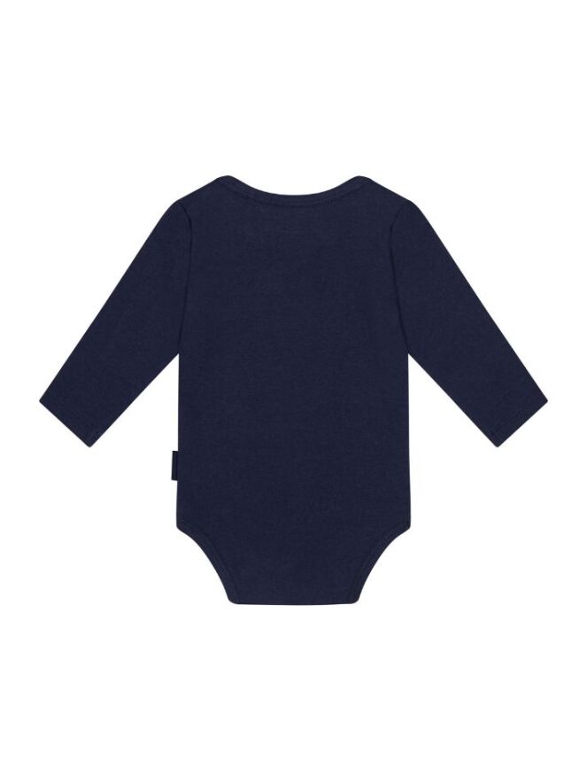 Dit rompertje heeft een grote logoprint op de voorkant en is donkerblauw.
