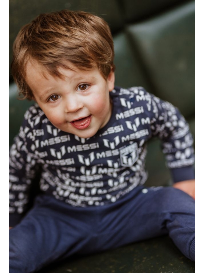 Deze jongens sweater heeft een allover print met Messi logo's. De sweater is donkerblauw.