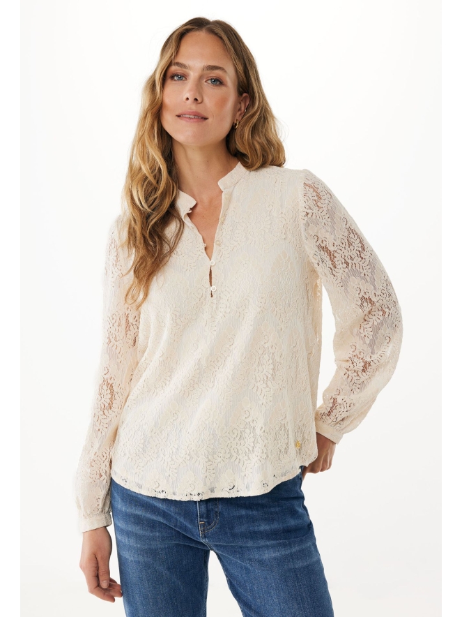 Prachtige lace blouse in cremekleur met mooi bloempatroon. De armen zijn doorschijnend, voor het lijfje hebben ze hier een binnenshirt van katoen onder verwerkt. Deze chique blouse draag je stijlvol op een nette pantalon maar misstaat ook zeker niet op een mooie jeans.