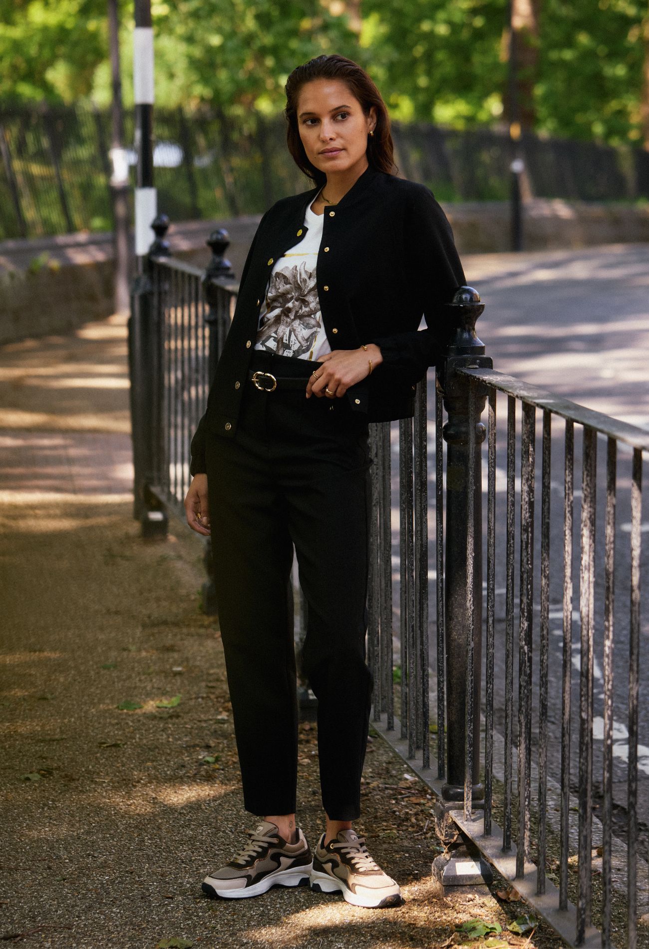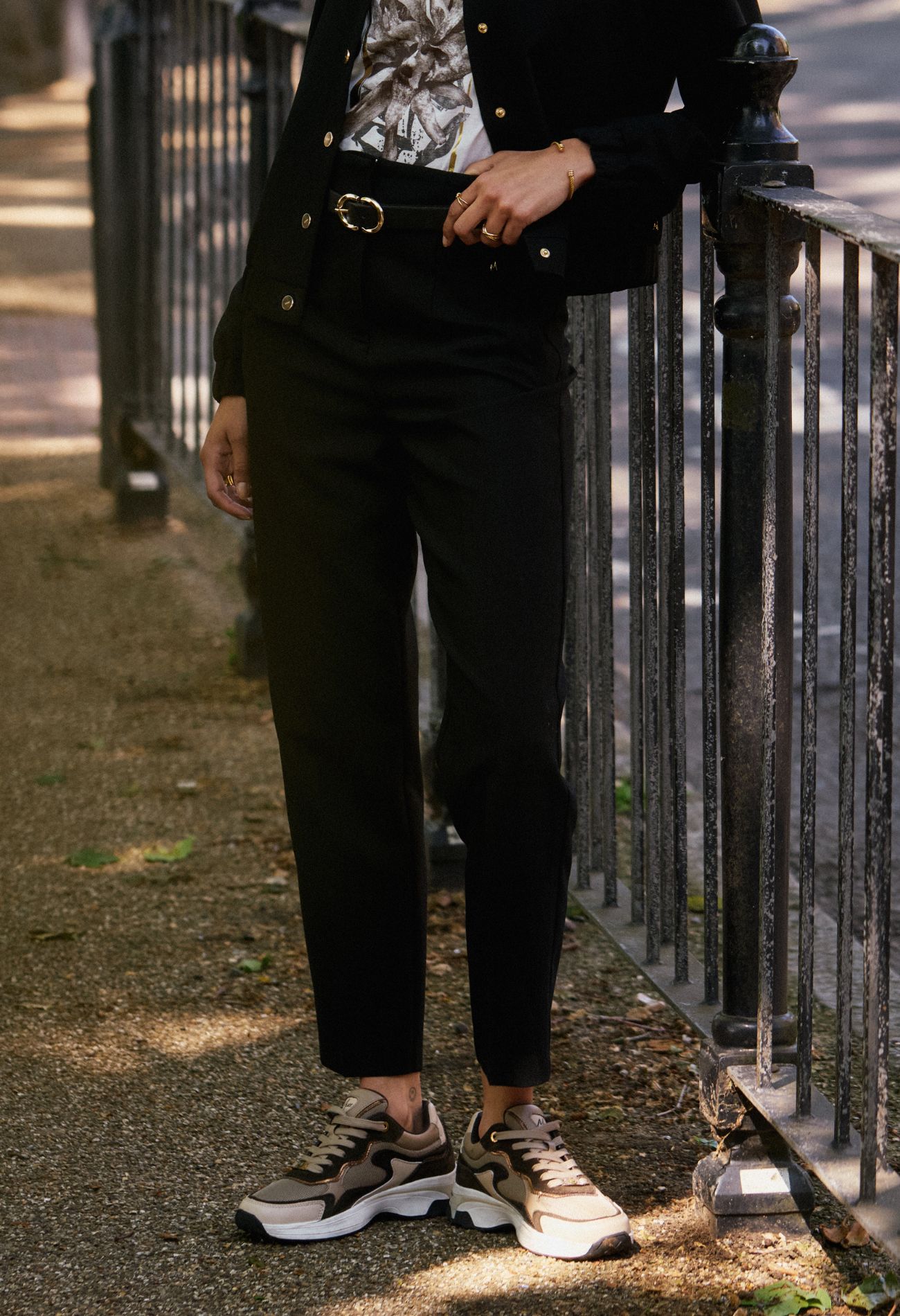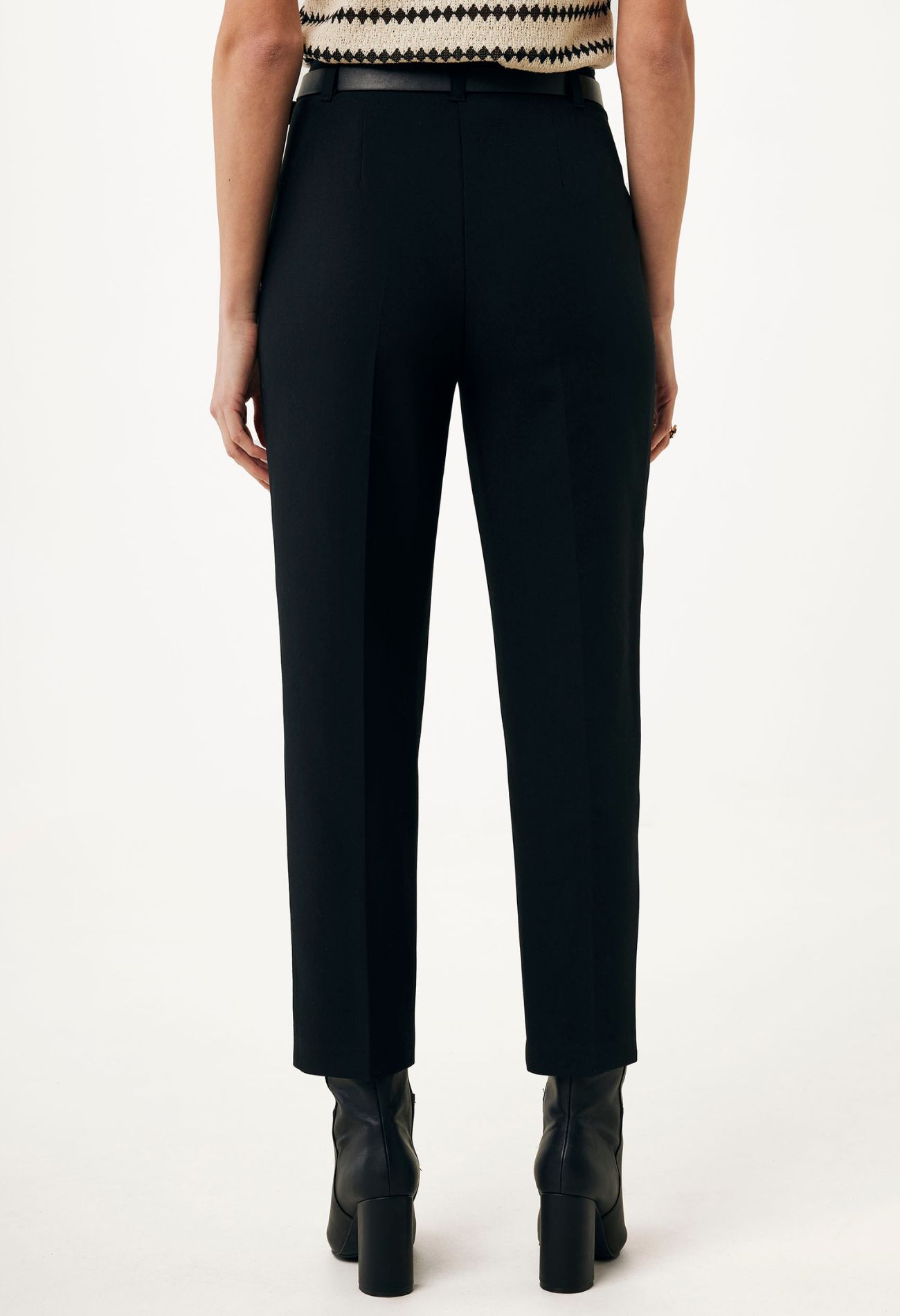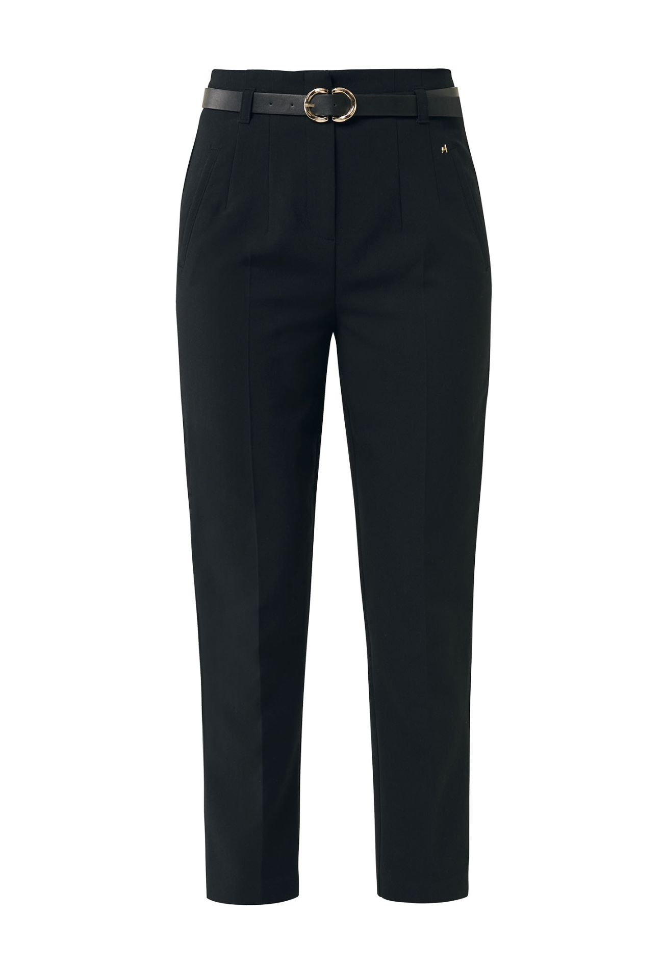 Prachtige zwarte tapered pantalon met sierzakken en een hoge taille. Deze broek heeft een kortere lengte en leent zich daardoor uitstekend om te kombineren met een mooie hak. Echter een leuke sneaker misstaat ook niet. Wordt geleverd met een zwarte syntetische ceintuur.