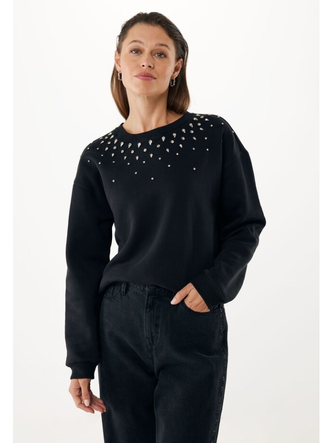 Fijne Mexx sweater met prachtige bling stenen in kastjes. Voorzichtigheid geboden met wassen i.v.m. de kwetsbaarheid van de stenen.