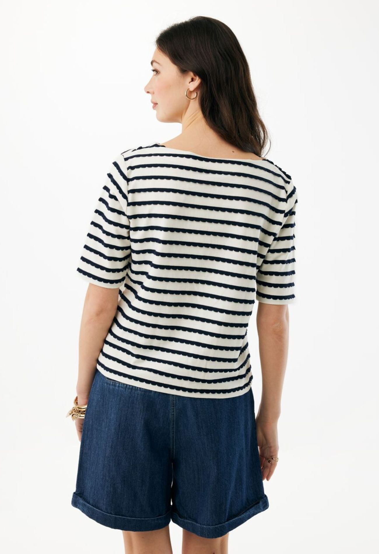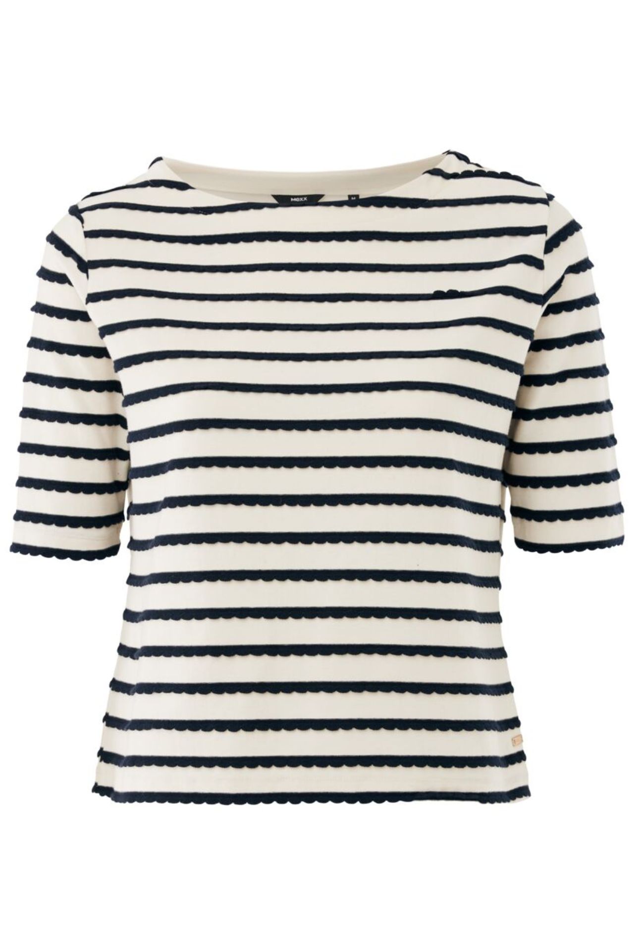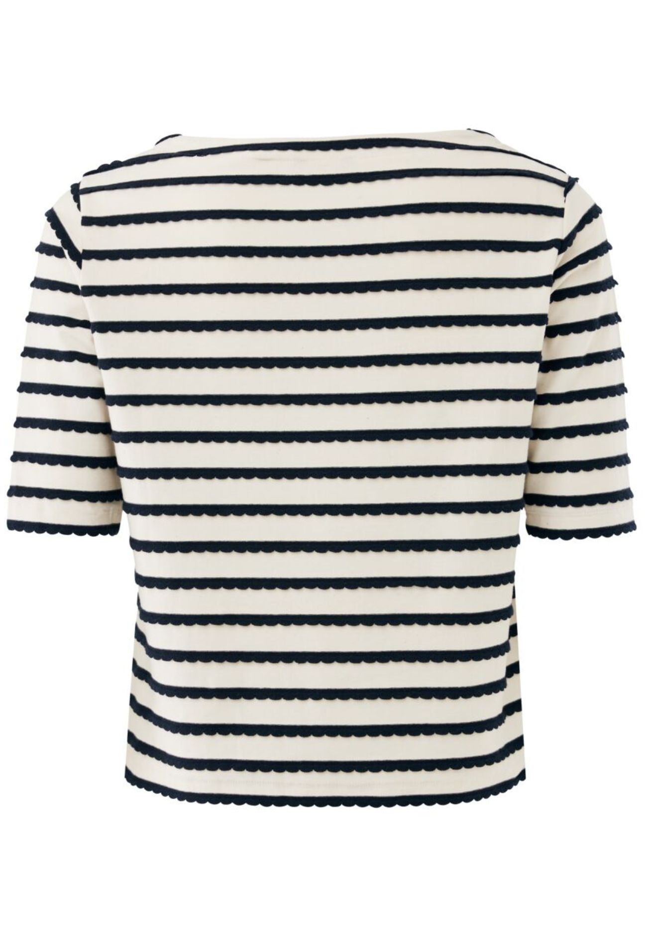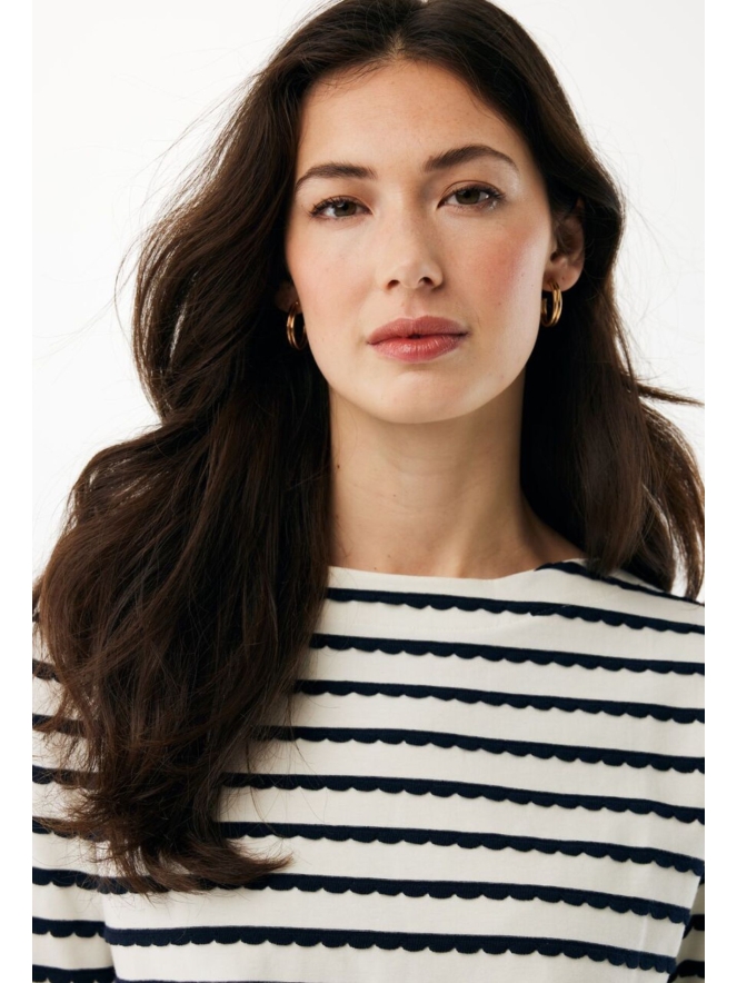 Dit stijlvolle T-shirt met boothals combineert een tijdloze uitstraling met een speelse twist. De elegante boothalslijn accentueert subtiel de hals en schouders, terwijl de golvende streep een dynamisch en modern effect toevoegt aan het ontwerp. Ahoy!