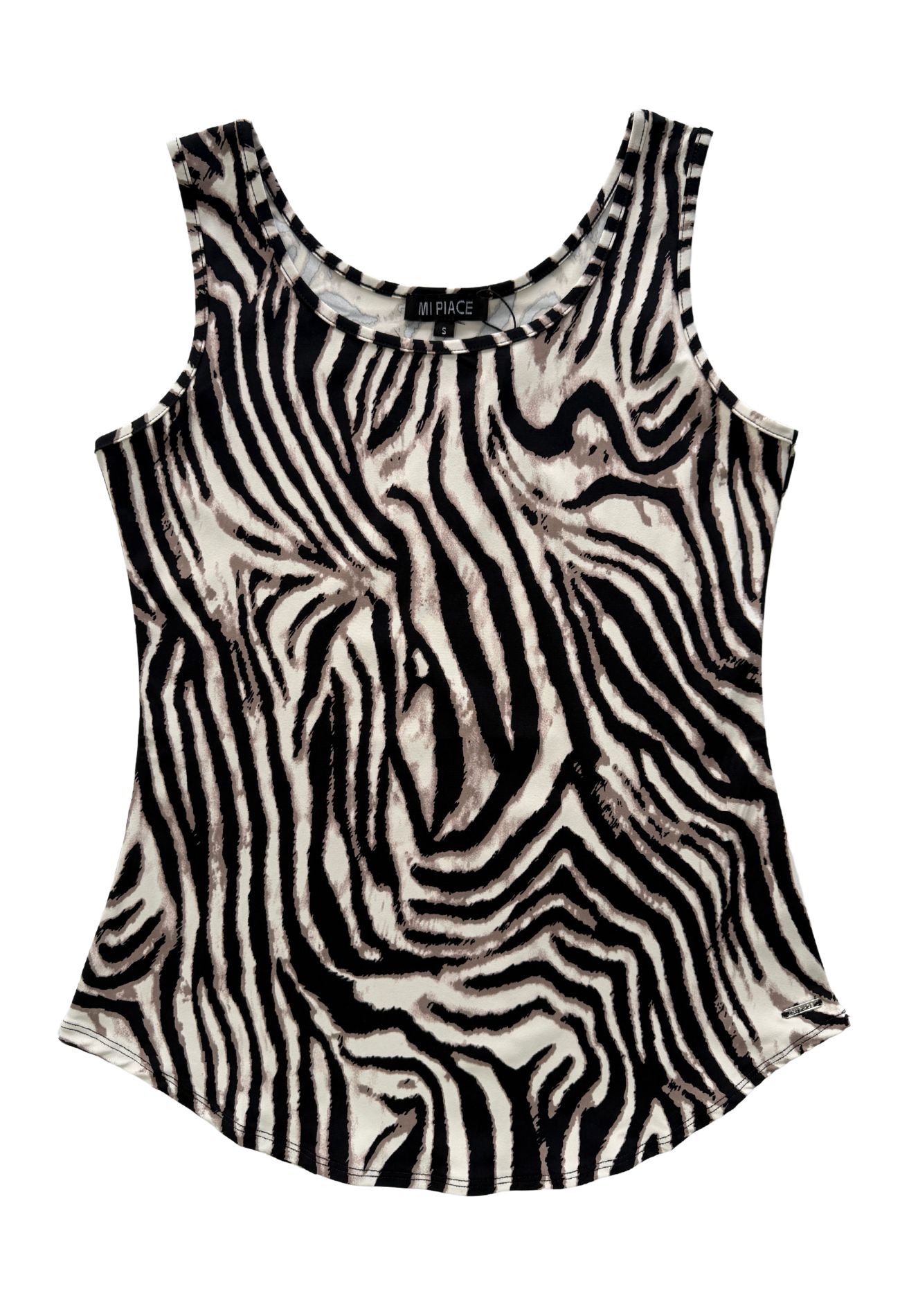 Super leuke singlet in hemdmodel van de welbekende travel stof van Mi Piace. Dit hemdje is rond aan de onderkant en heeft een trendy zebra print.