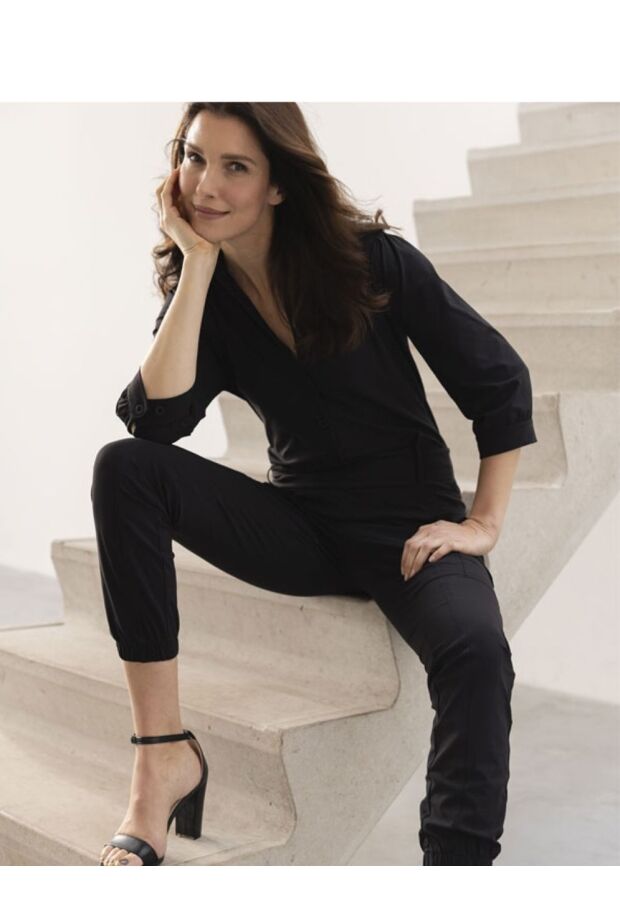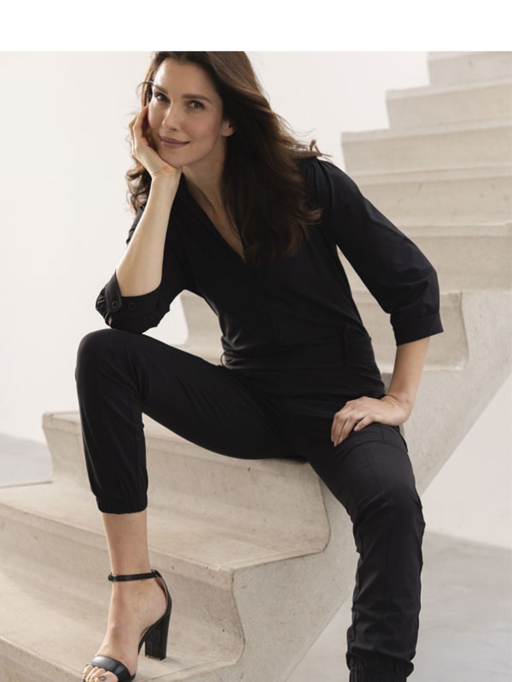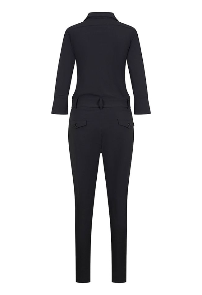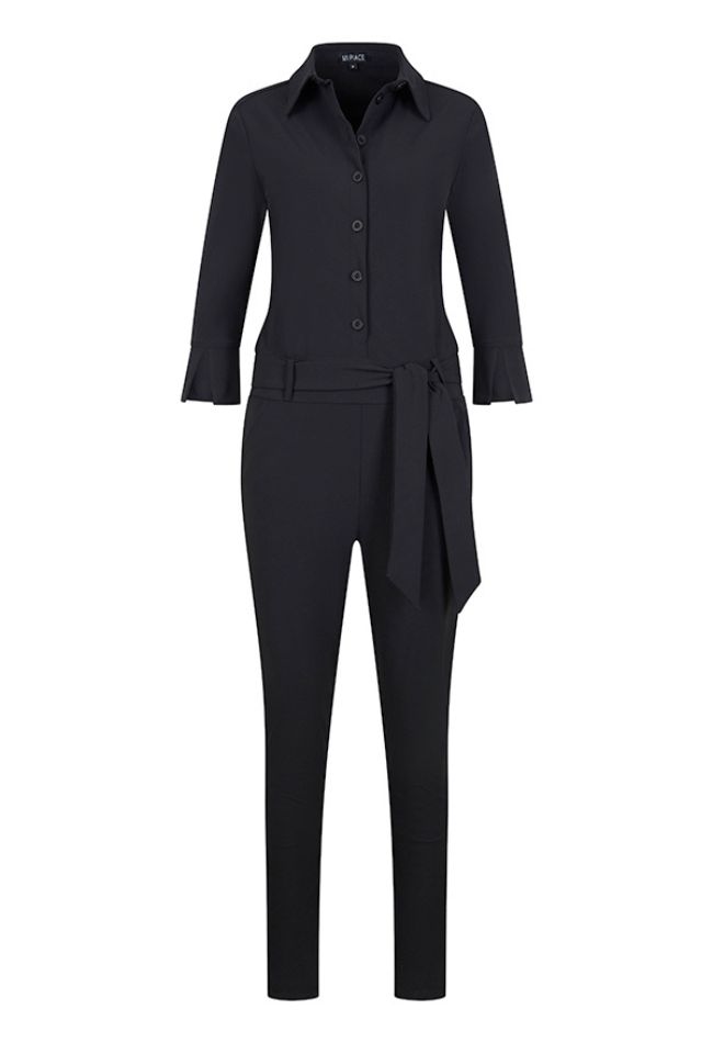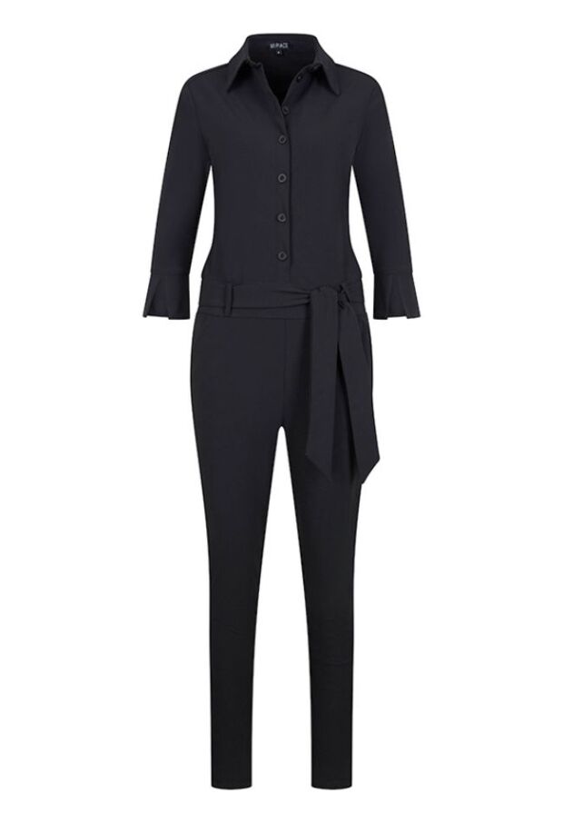 Zwarte jumpsuit van travel stof met een kraagje en een strik riem. De mouwen hebben een 3/4 lengte en een splitje in de uiteinden. Valt op maat.