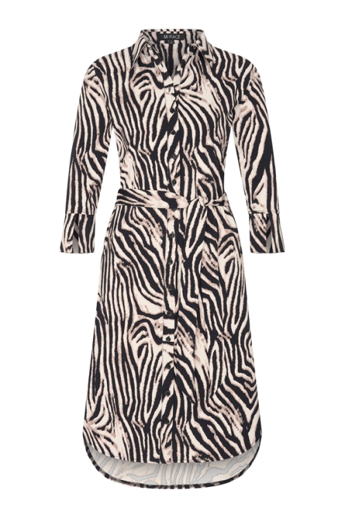 Doorknoopjurk van travel stof met een dierlijke zebra print. Deze kreukvrije jurk biedt ultiem draagcomfort dankzij de stretch. De bijgevoegde ceintuur accentueert prachtig de taille. Een veelzijdige keuze voor elke gelegenheid.