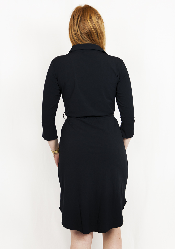 De blouse jurk is van travel stof en heeft een strik riem, 3/4 mouwen met een split in de uit einden van de mouw. Valt op maat.