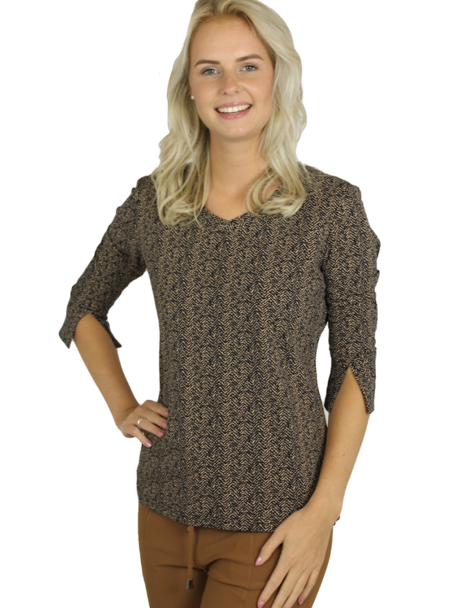 Travel t-shirt met 3/4 mouwen van Mi Piace. De mouwen hebben een split aan de onderkant. De top heeft een print. Valt ruim, hoort ook zo. Materiaal: 84% polyamide, 16% elasthan. 30 graden wassen, niet in de droger, niet bleken, koud strijken.