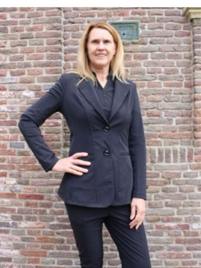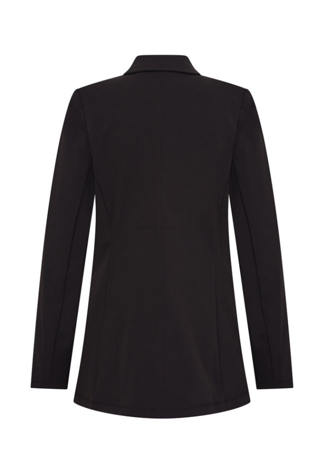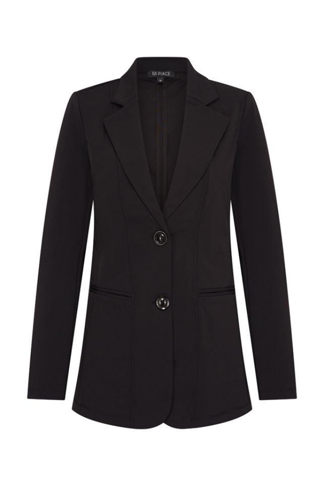 Basic blazer van travel stof. Deze blazer sluit aan de voorzijde met 2 knopen.