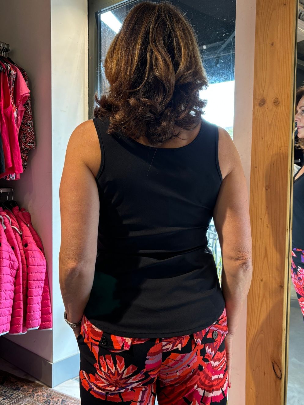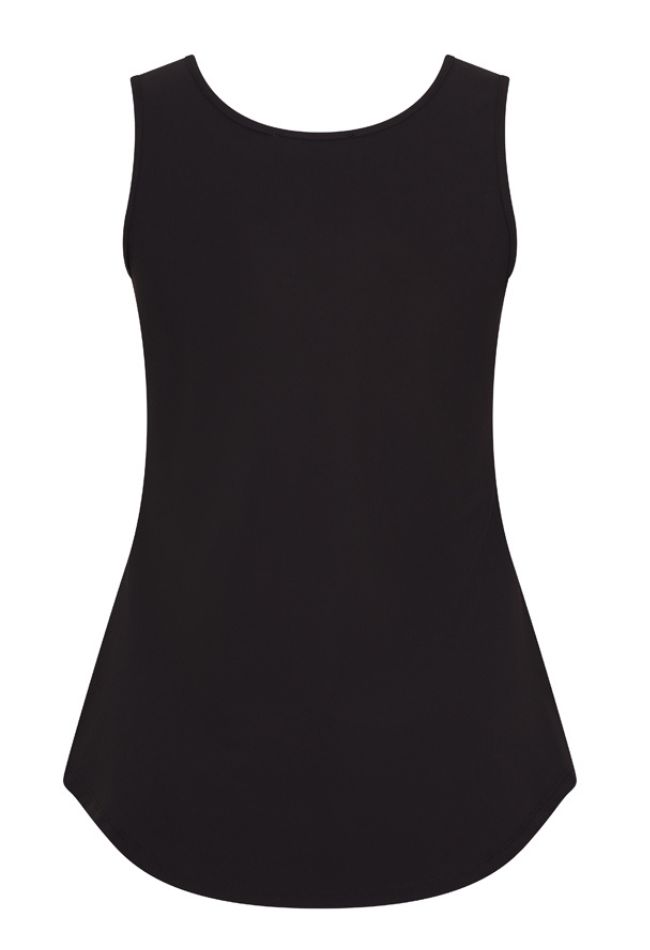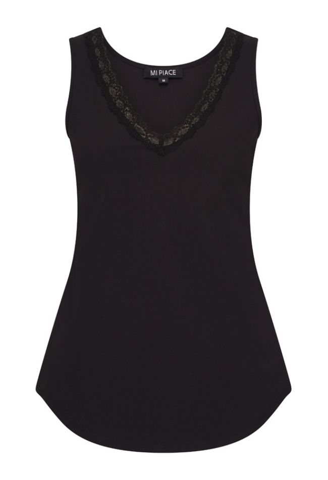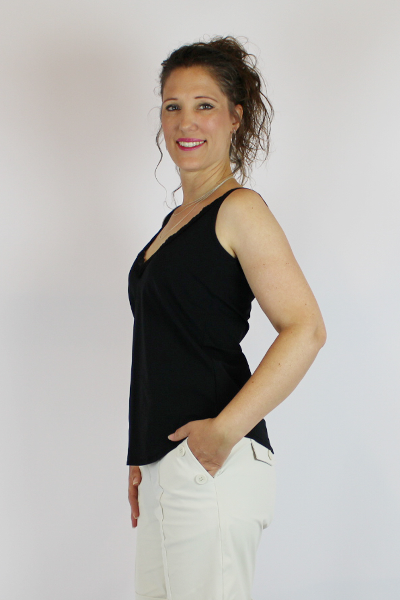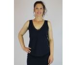 Travel singlet met een kanten v-hals. Dit hempje heeft een effen kleur en loopt rond af.