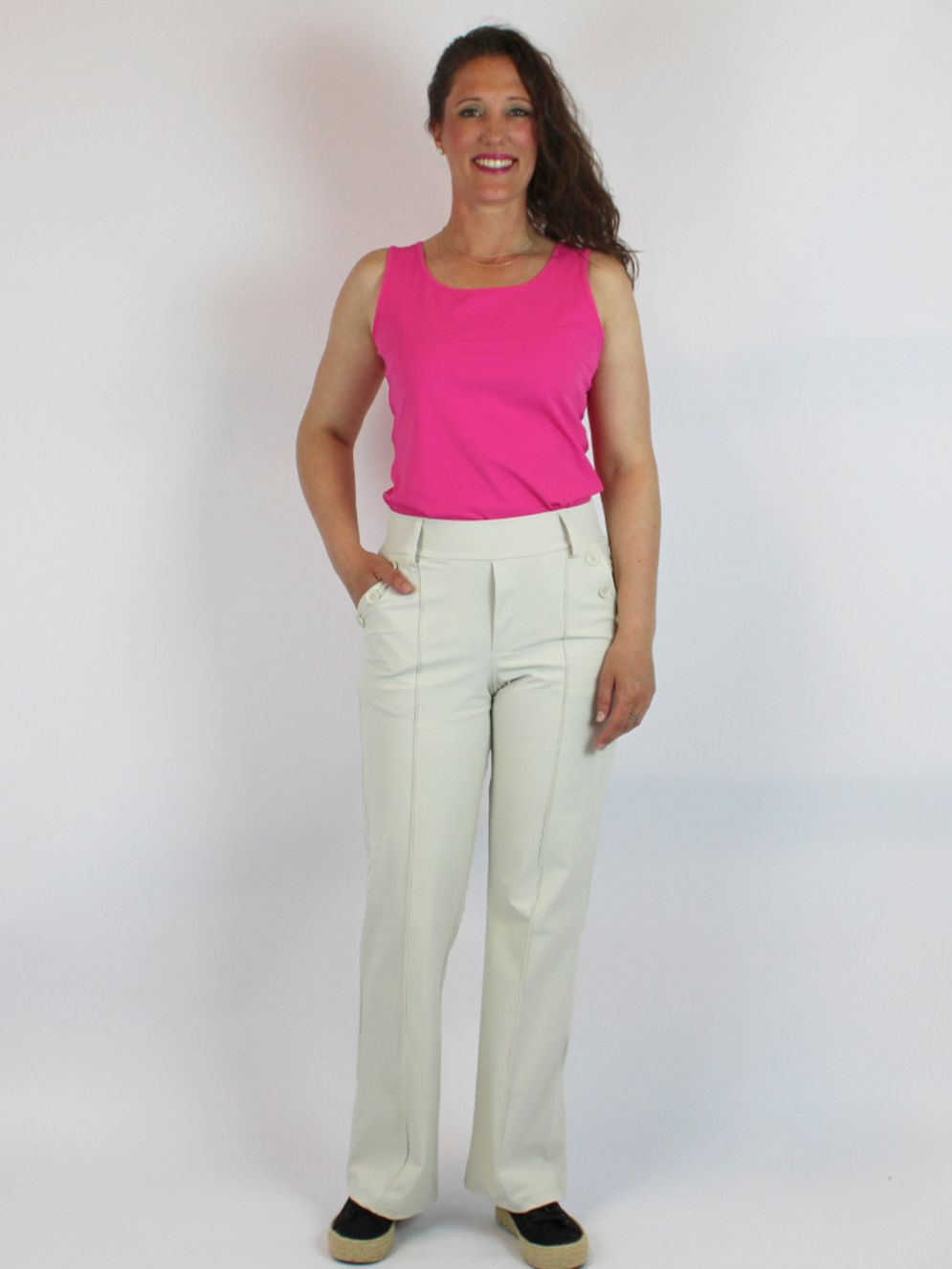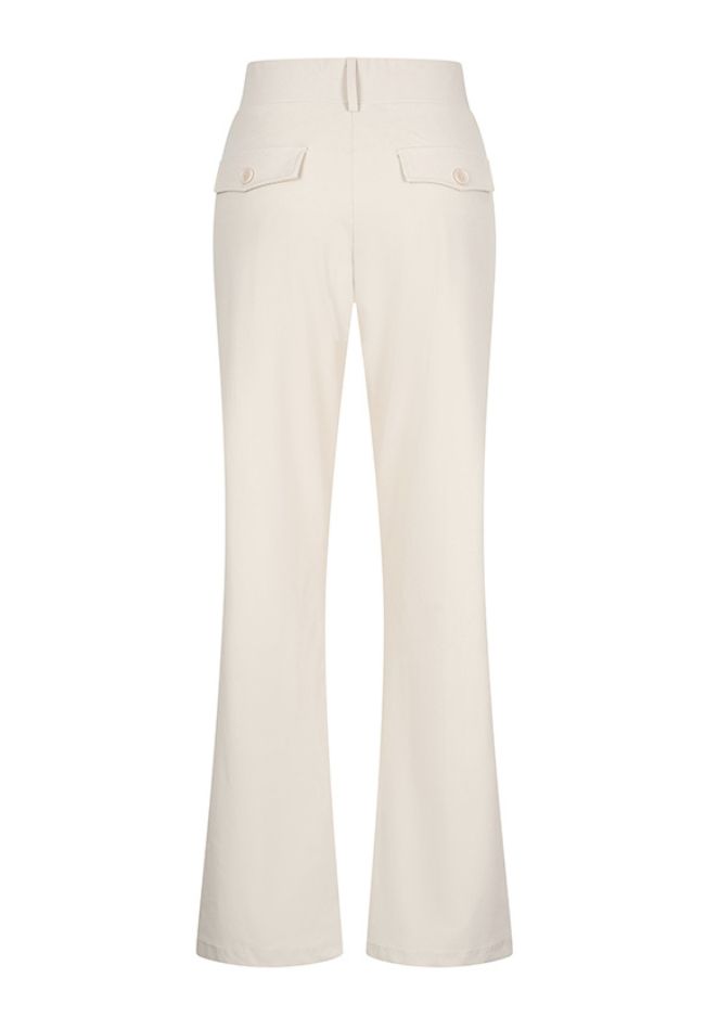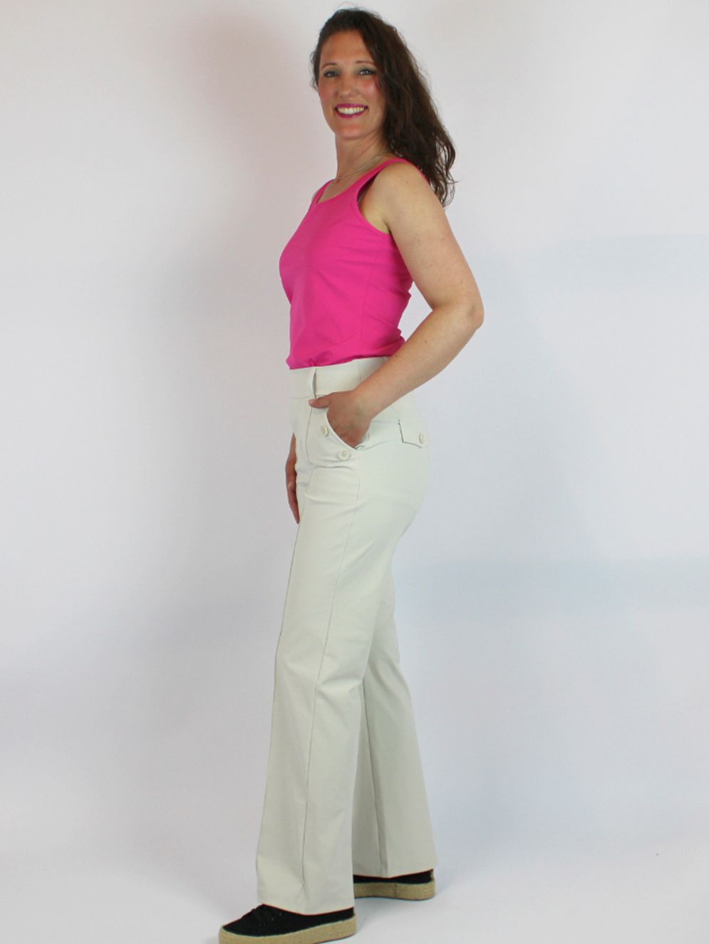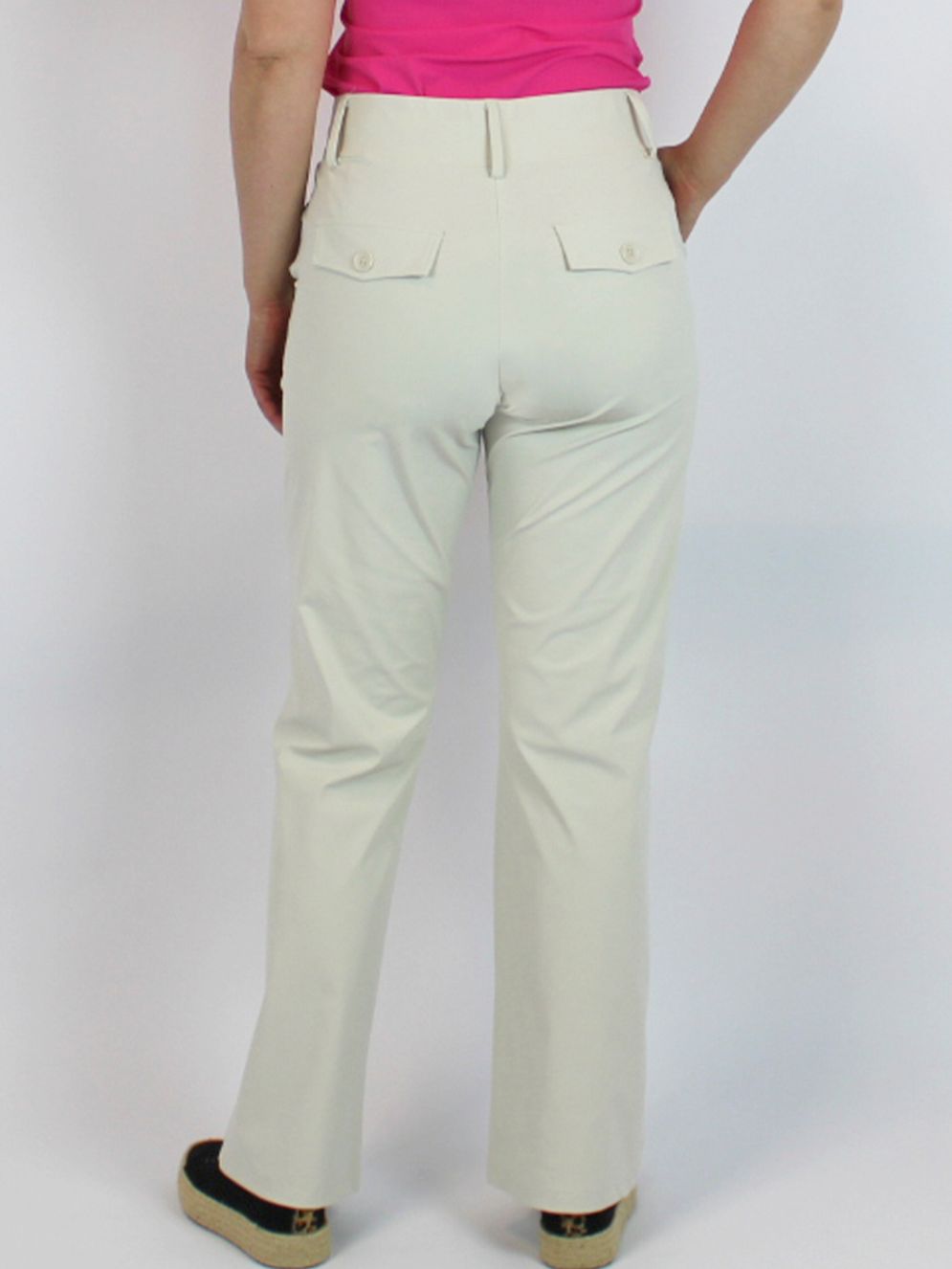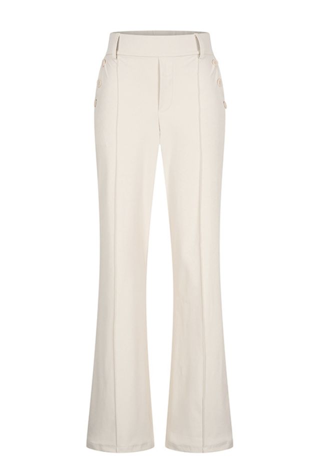 Deze broek van travel stof is een recht model en heeft knopen bij de zak met een siernaad opnaad die voor over het been loopt.