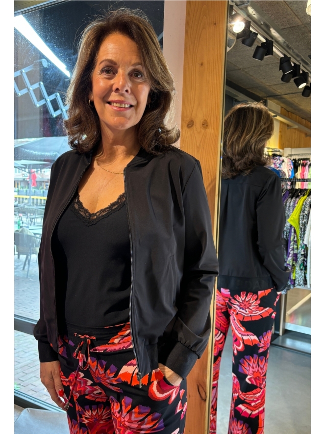 Dit bomberjack van travel stof is een sportief model. Het jackje heeft twee steekzakken en de boord onder en de mouwen hebben een brede elastieken band met daarop ingeweven de tekst Mi Piace. Eigentijds, tijdloos, sportief en makkelijk te combineren!