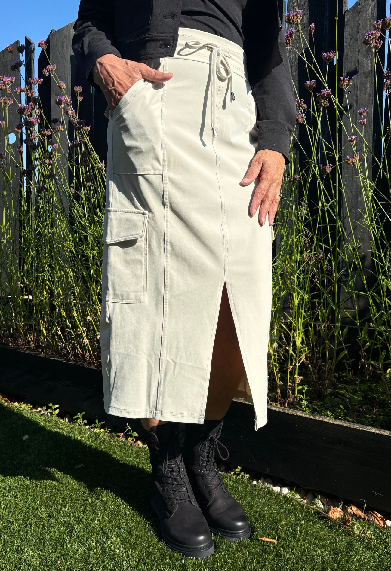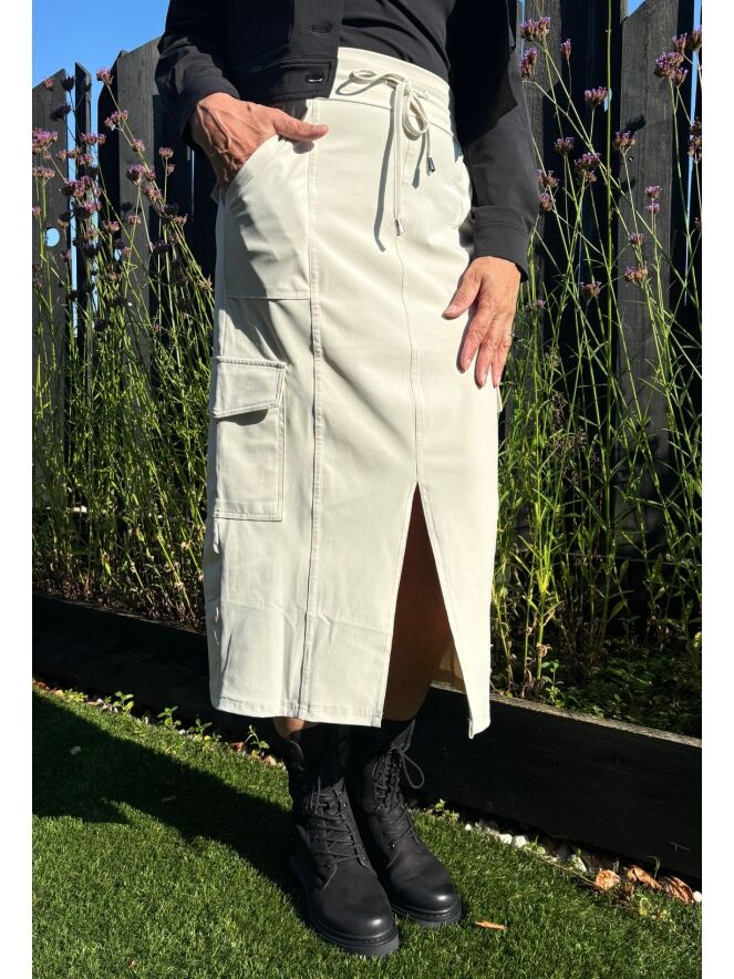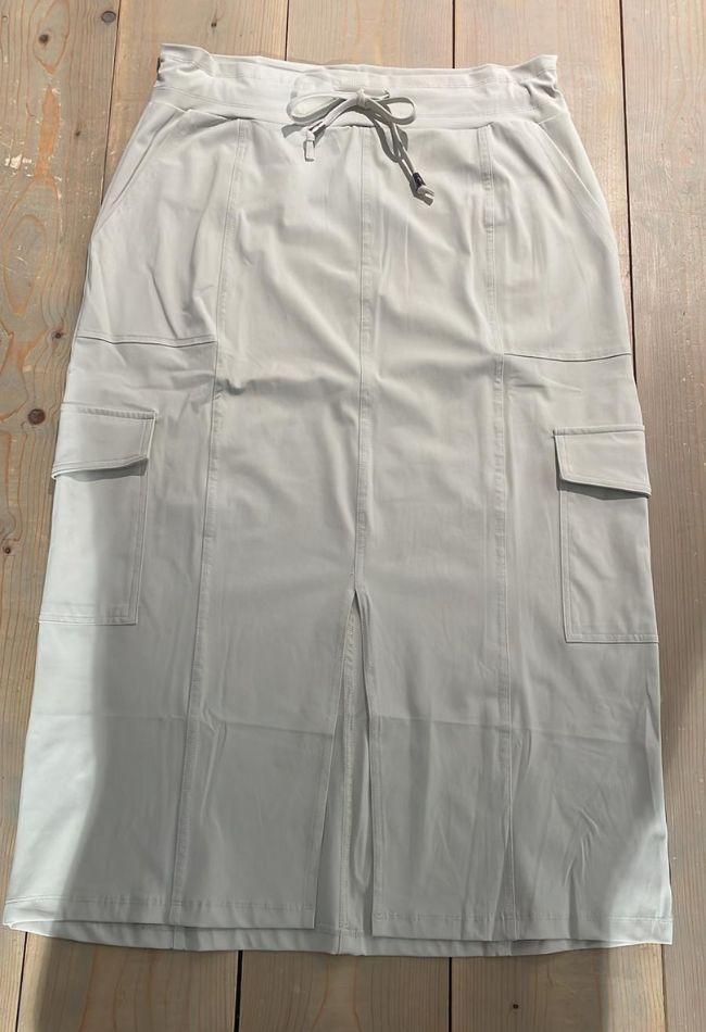 Deze enorm stoere cargo travel rok is een hardloper in onze winkels! Hij is er in het zwart en kit. Heerlijk comfortabel met de steekzakken en fijne tailleband met welbekend koord wat je gewend bent van Mi Piace. Draag er een T-shirtje op en je bent al klaar. Eindeloos te combineren. Must have in iedere garderobe! Aan de voorzijde zit een split voor een vlotte uitstraling en niet de vergeten de cargo zakken op de zijkanten. Run baby run!