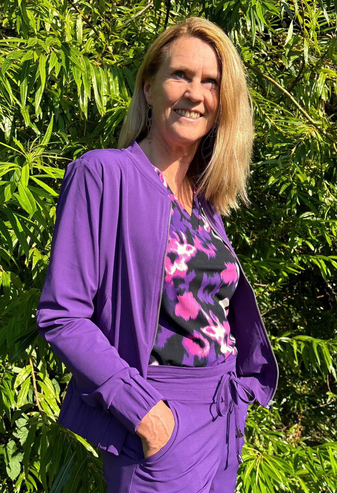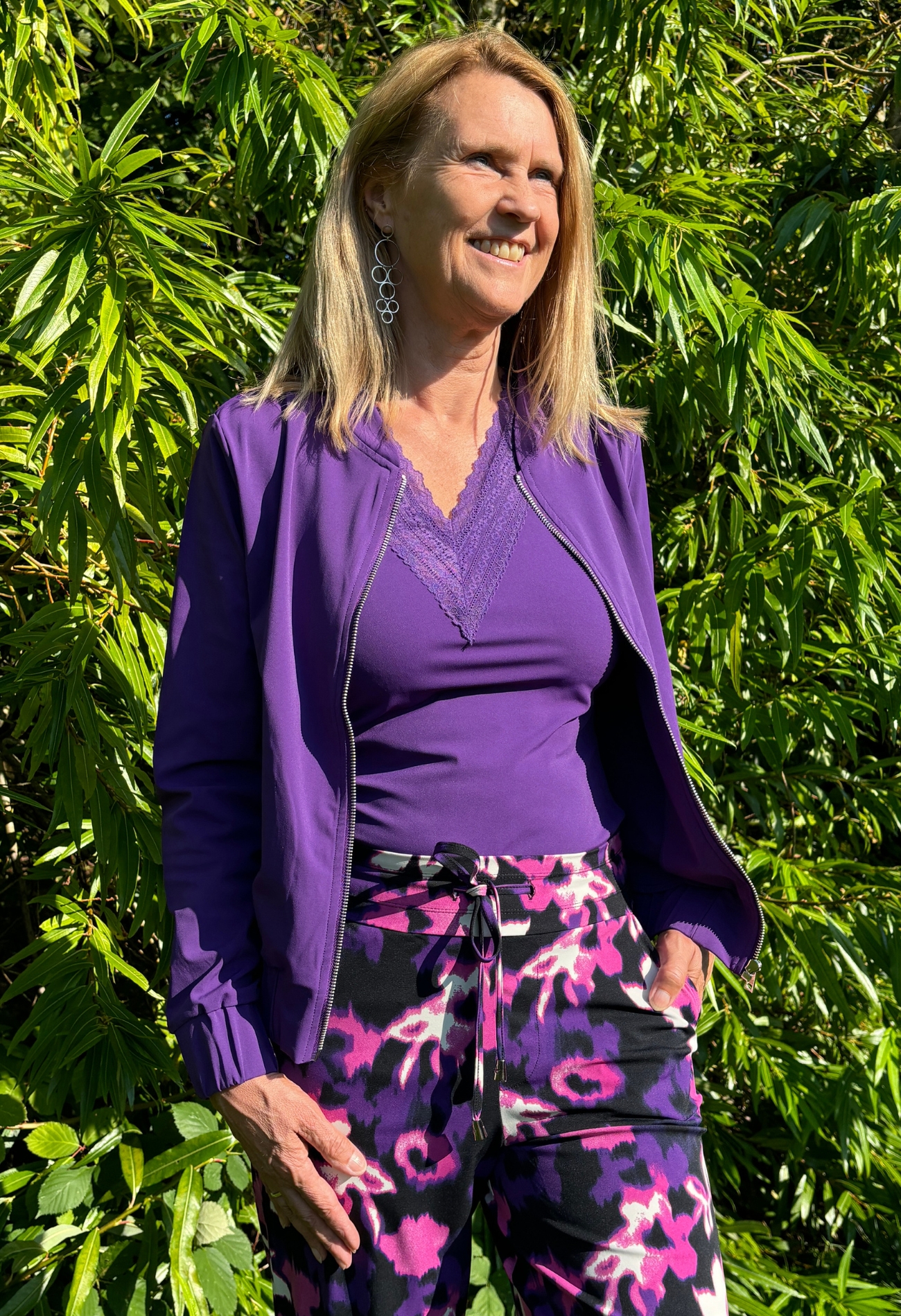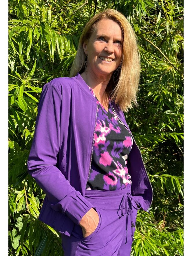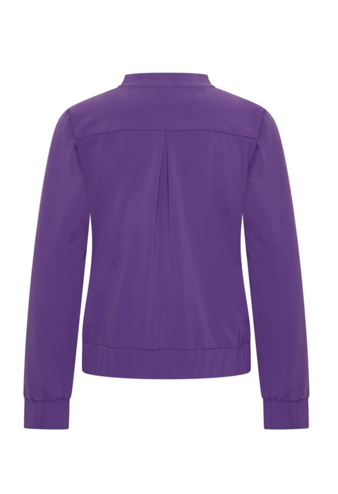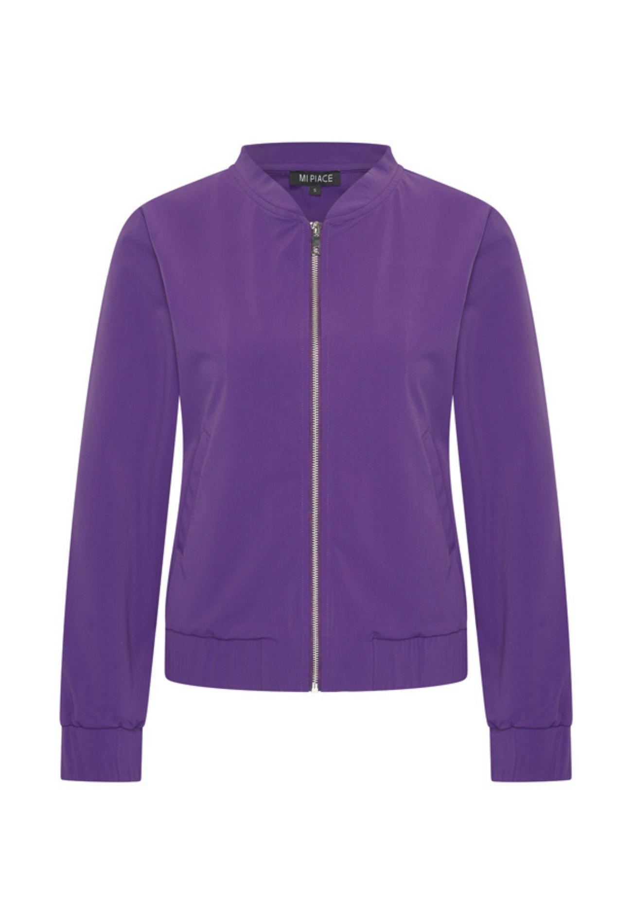 Dit bomberjack van travel stof is een sportief model. Het jackje heeft twee steekzakken en de boord onder en de mouwen hebben een brede elastieken band met daarop ingeweven de tekst Mi Piace. Eigentijds, tijdloos, sportief en makkelijk te combineren!