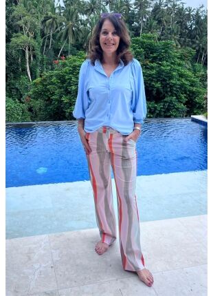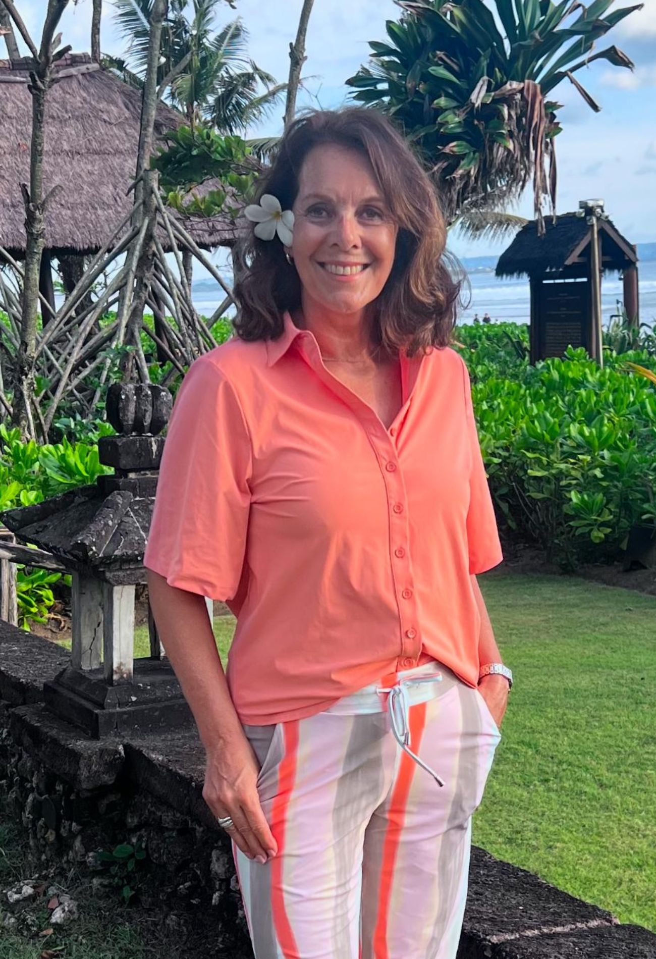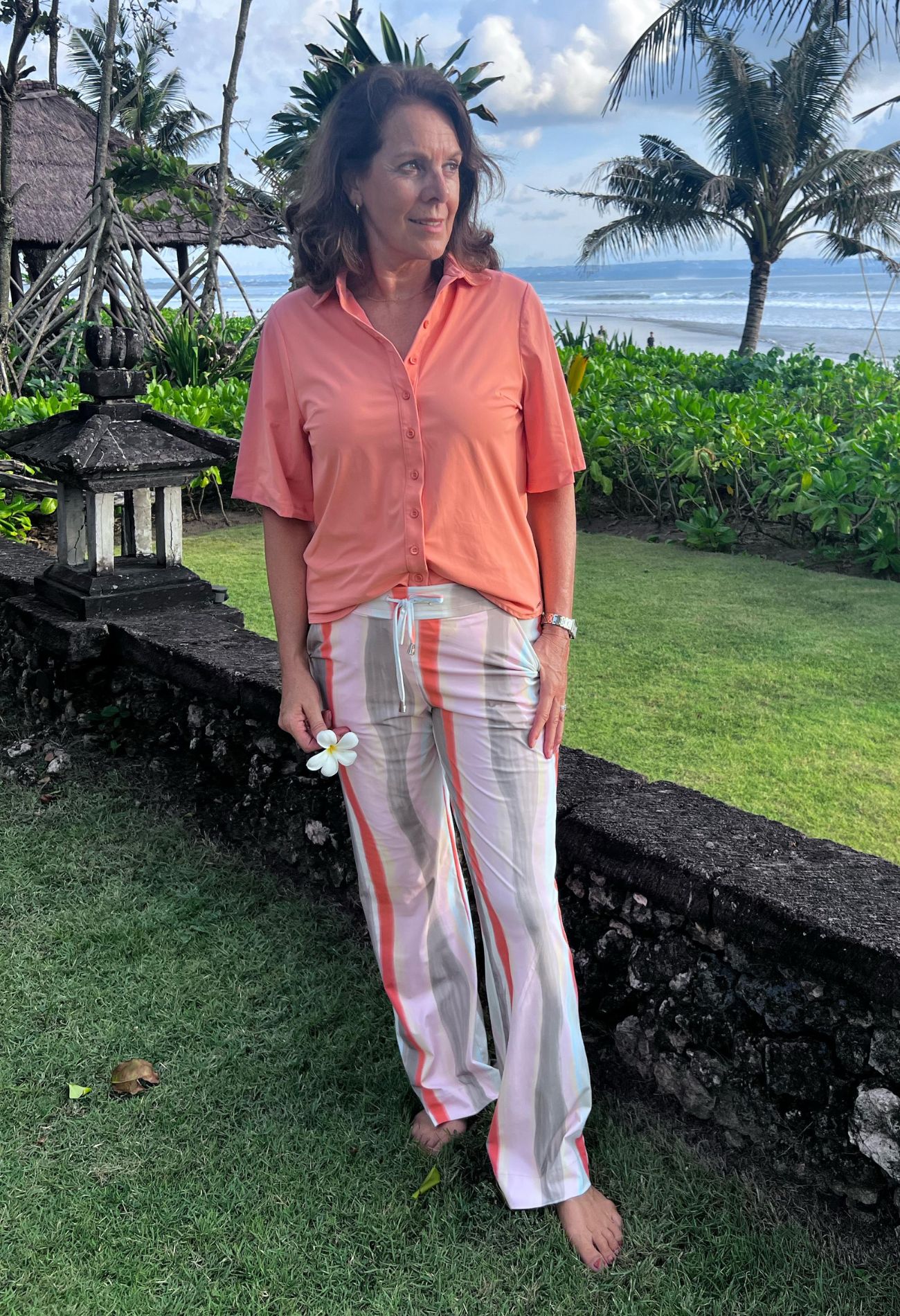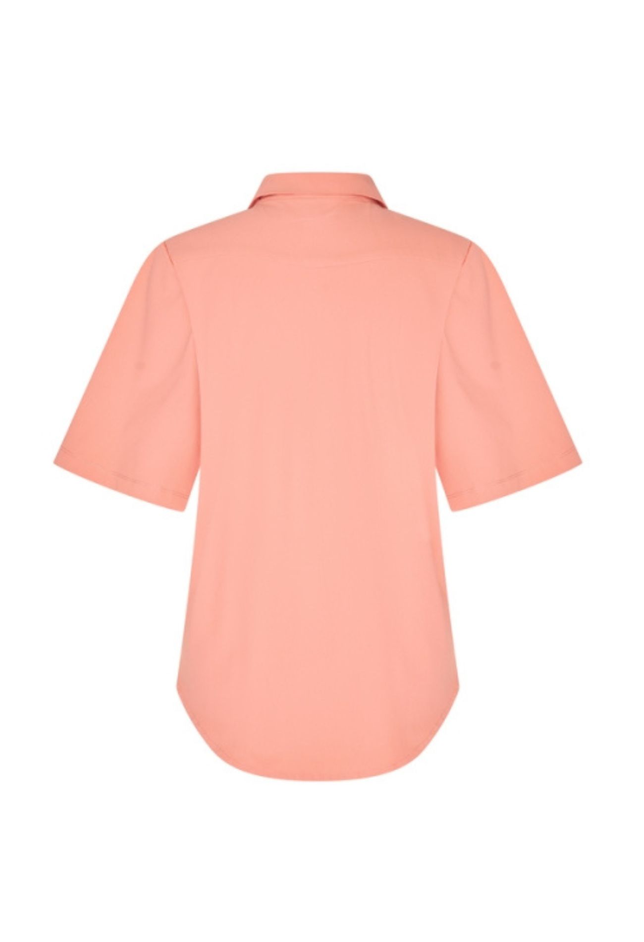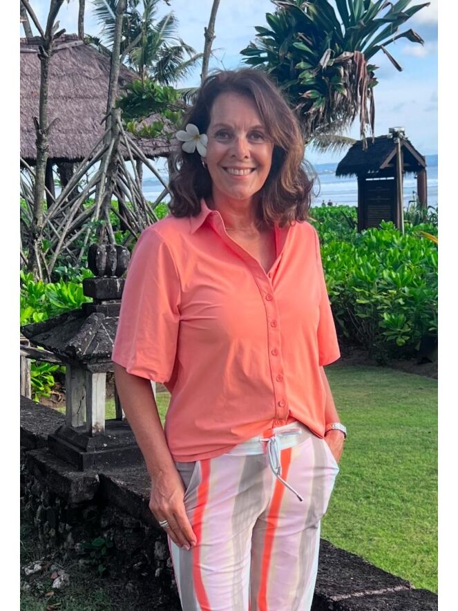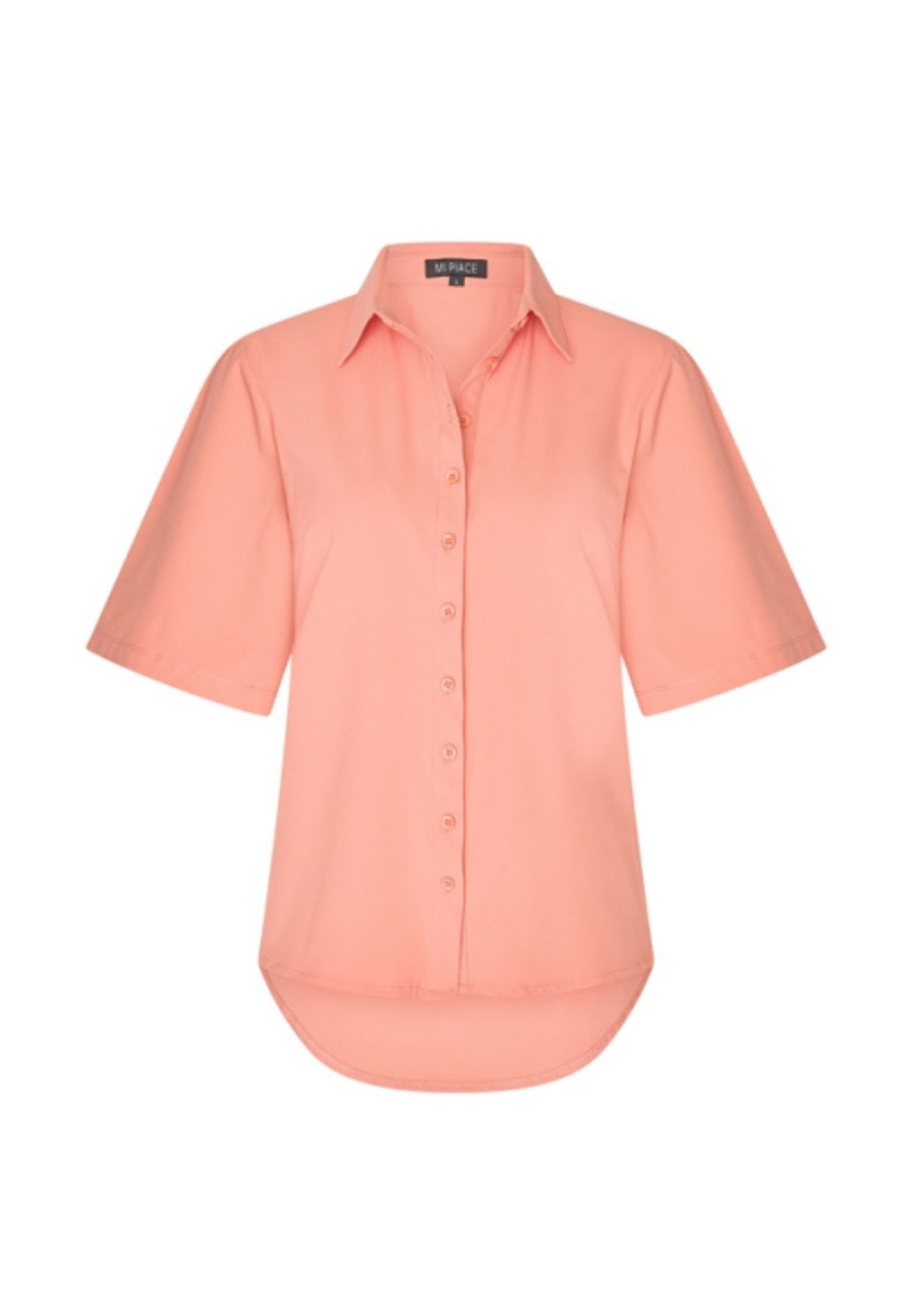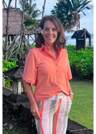 Mooie travelstof blouse van het merk Mi Piace. De travelblouse is uitgevoerd in een effen abrikoos kleur. De mouw is kort maar wijd. Draagt comfortabel door de soepel vallende stof en ademende capaciteit. Vallen op maat.