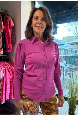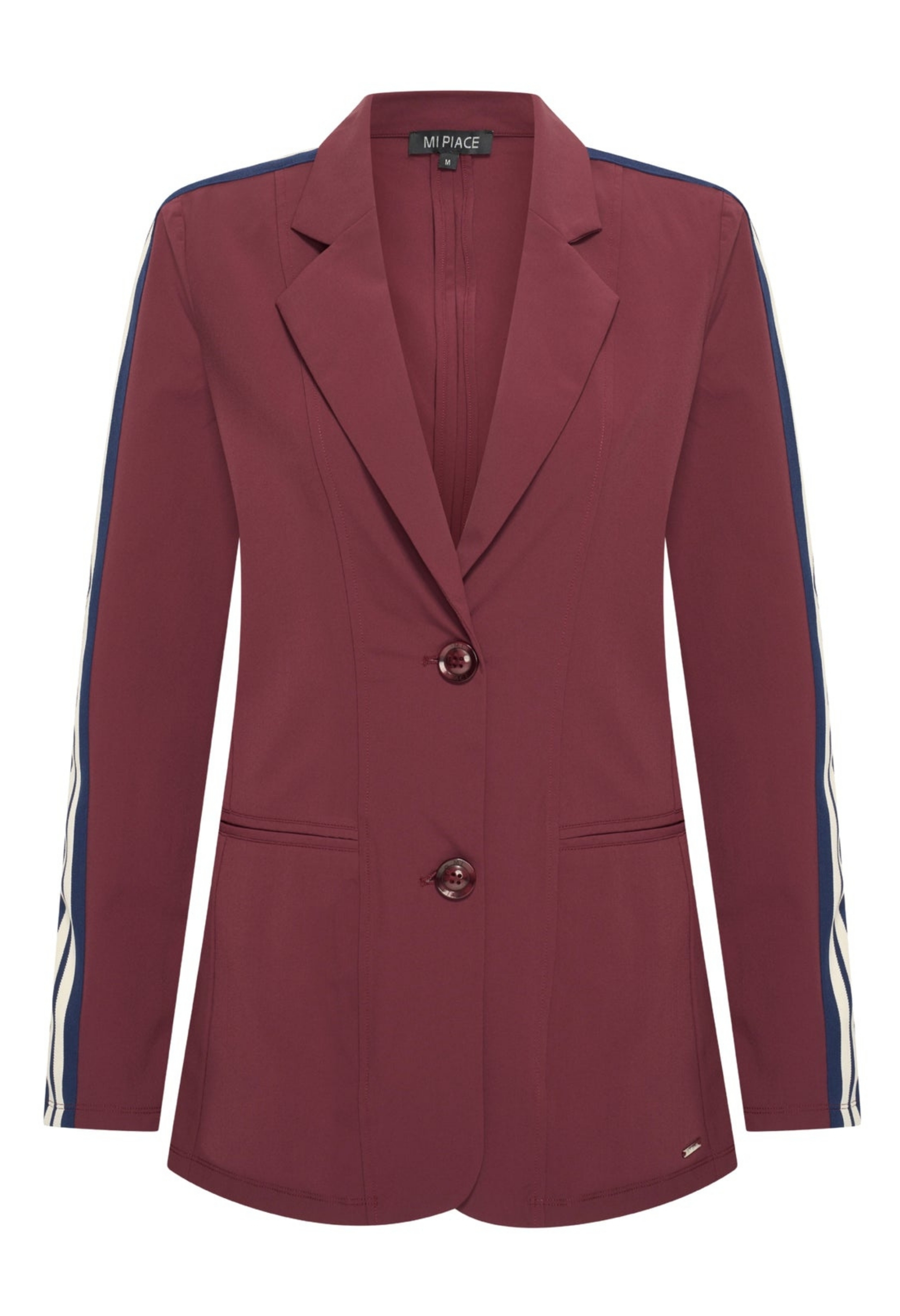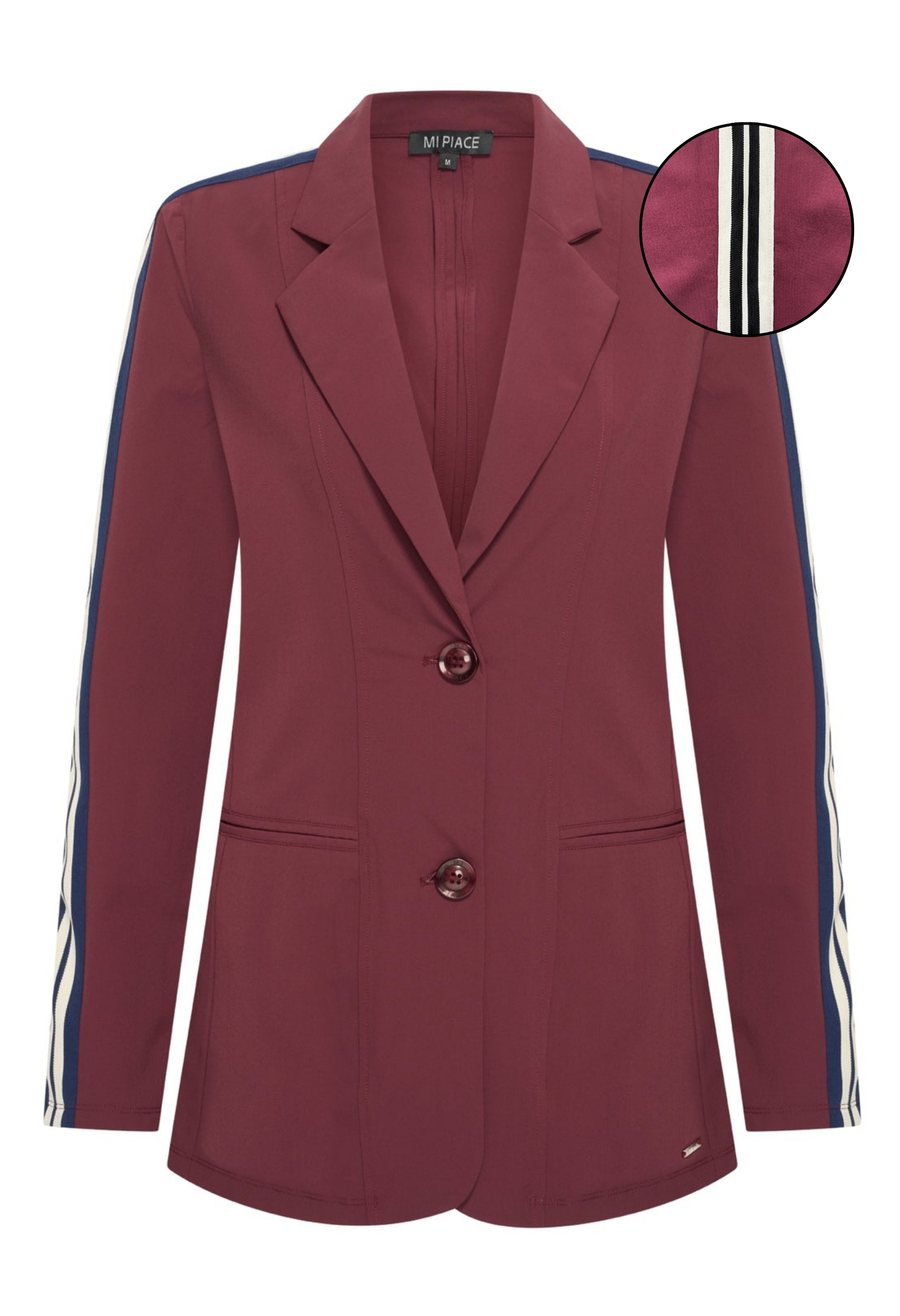 Fijne blazer van travel stof van Mi Piace. Deze blazer heeft een sportieve zwart /kit kleurige baan over de schouder en mouw lopen. Een blazer of pantalon met streep op de zij is helemaal trendy deze winter!