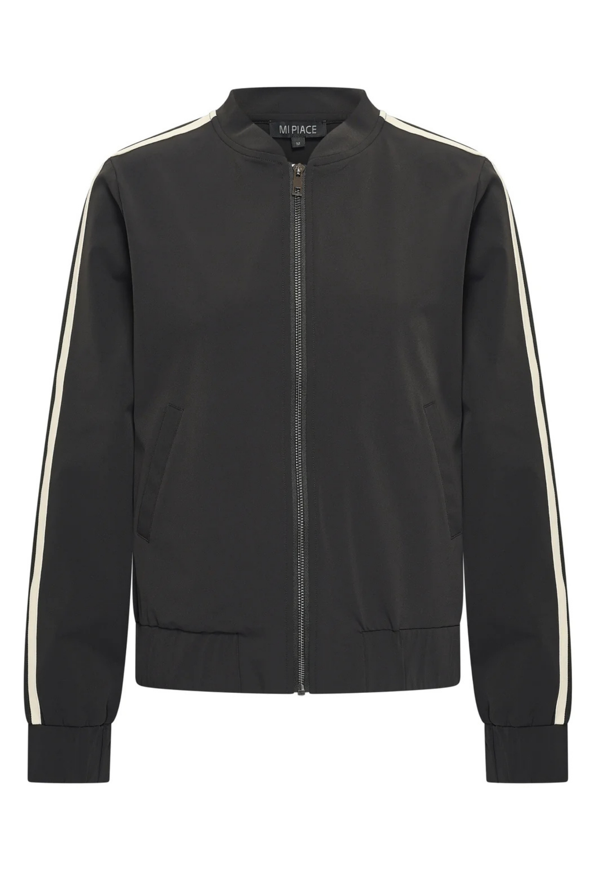 Trendy jack in bomber model van Mi Piace. Deze bomber heeft een gestreepte bies over de mouw, twee fijne steekzakken en maakt jouw look sporty chick!