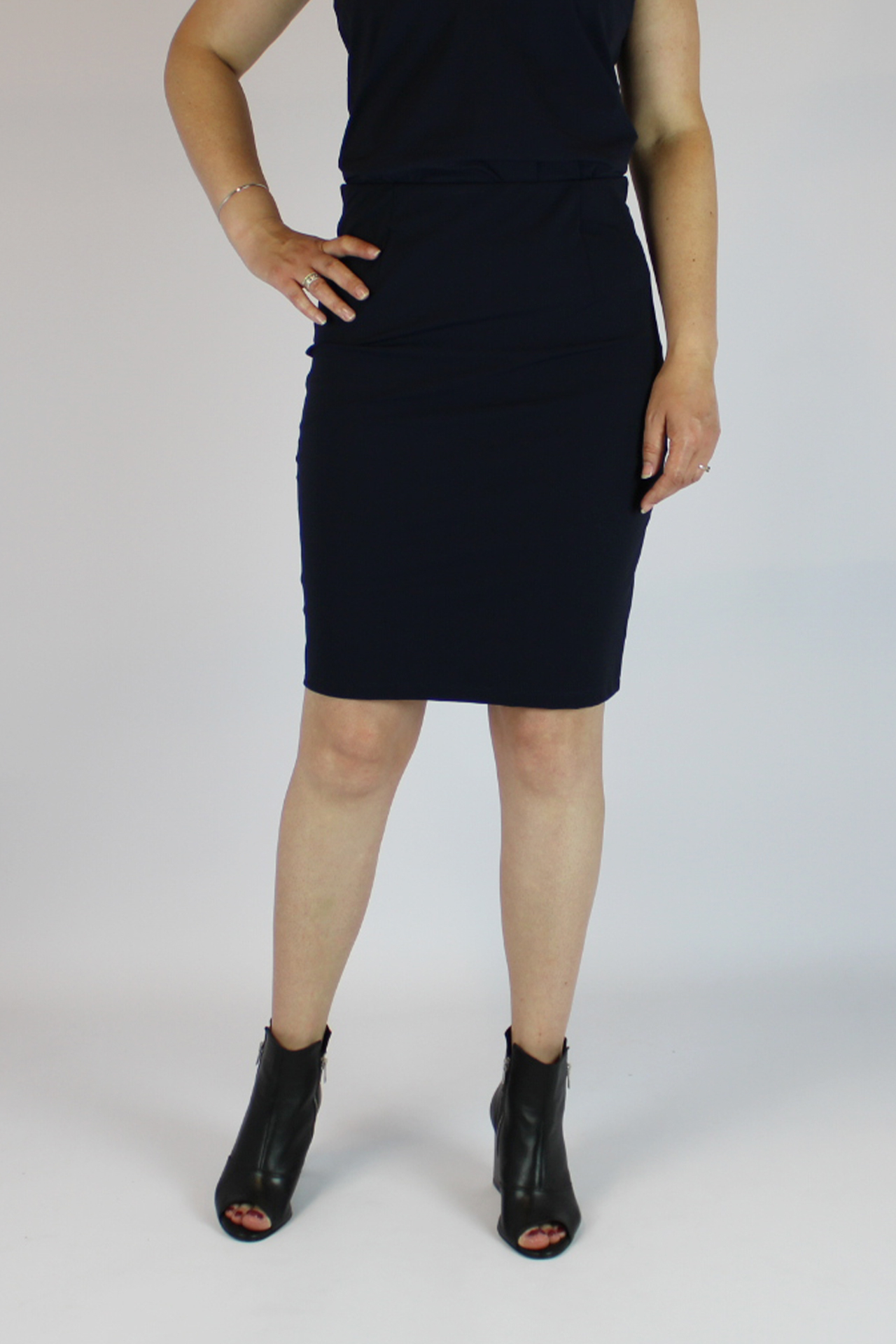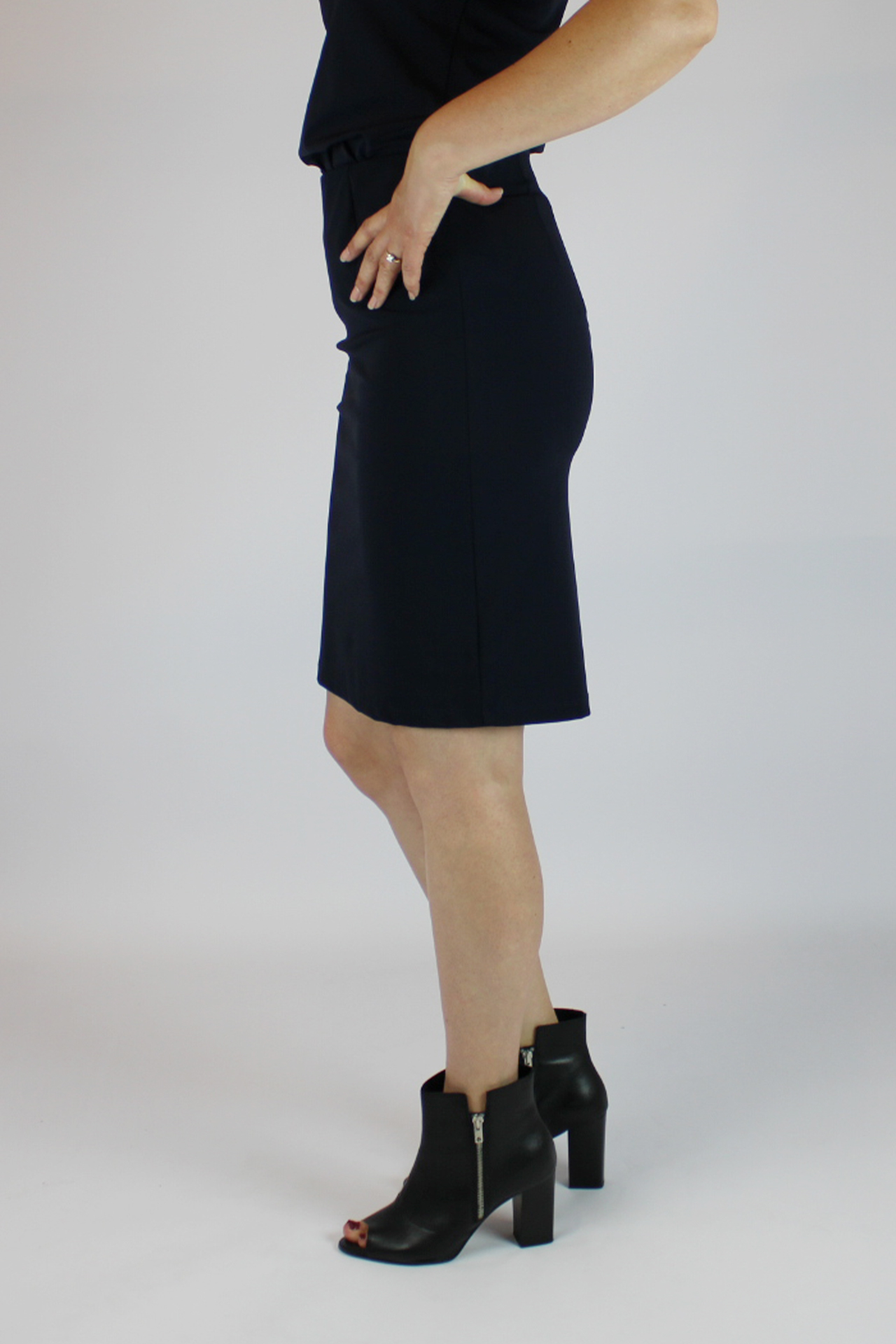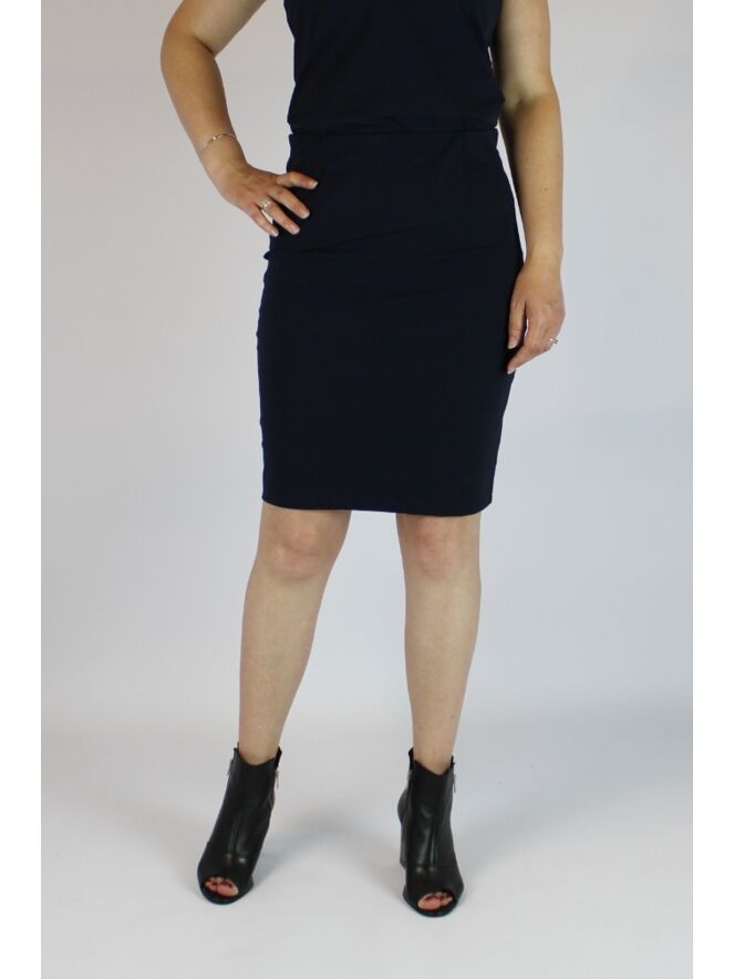 Rok van travel stof. Deze rok valt op de knie of net er boven met een split aan de achterkant. De rok heeft een elastieken taille en een rechte pasvorm.