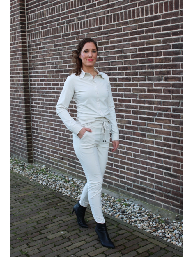 Travel broek van stevige travel stof, heeft voor zakken en een veter in de taille.