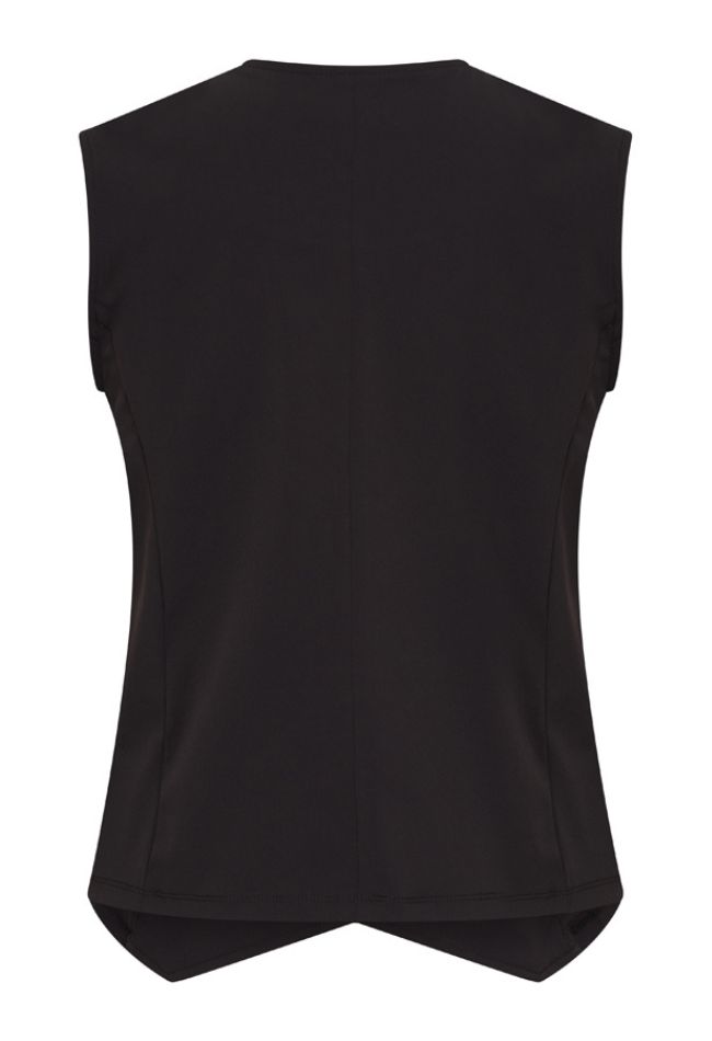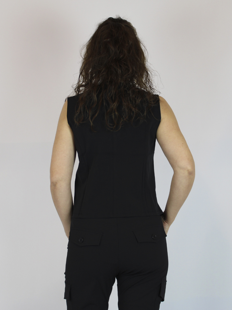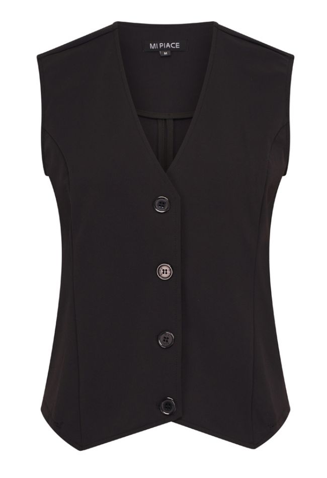 Dit gilet van travel stof sluit met vier knopen en is licht getailleerd.