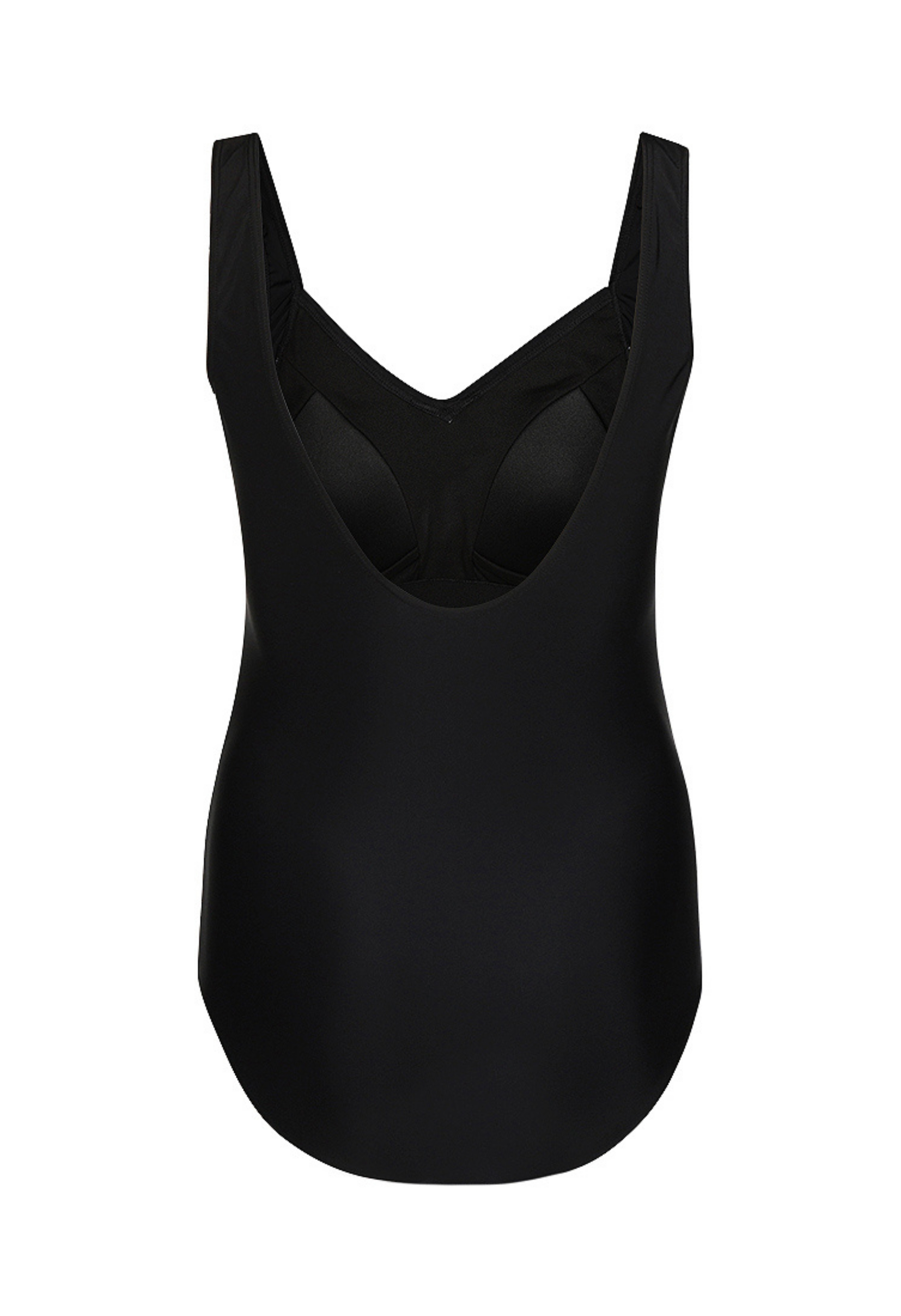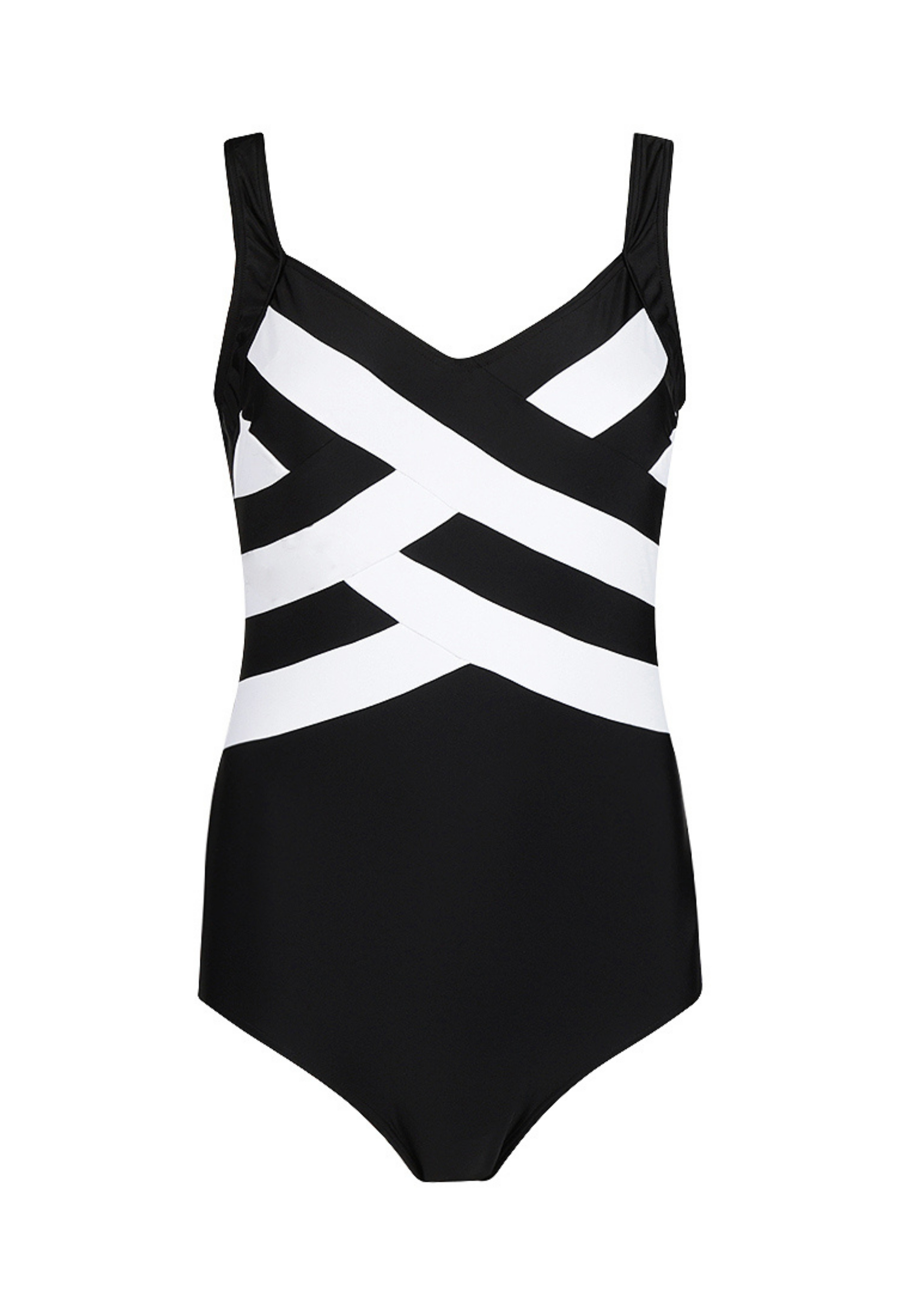 Dit damesbadpak van Mila uit de zomercollectie combineert een tijdloze uitstraling met een moderne twist. Het zwarte ontwerp wordt stijlvol geaccentueerd door zwart-wit gestreepte details en een flatterende V-hals. Gemaakt van sneldrogend materiaal met comfortabele stretch, ideaal voor ontspannen stranddagen of actieve zwemmomenten. Combineer dit badpak met de bijpassende pareo, artikelnummer R51231-23 ? deze elegante omslagrok zorgt voor een perfecte cover-up en een complete beachlook.