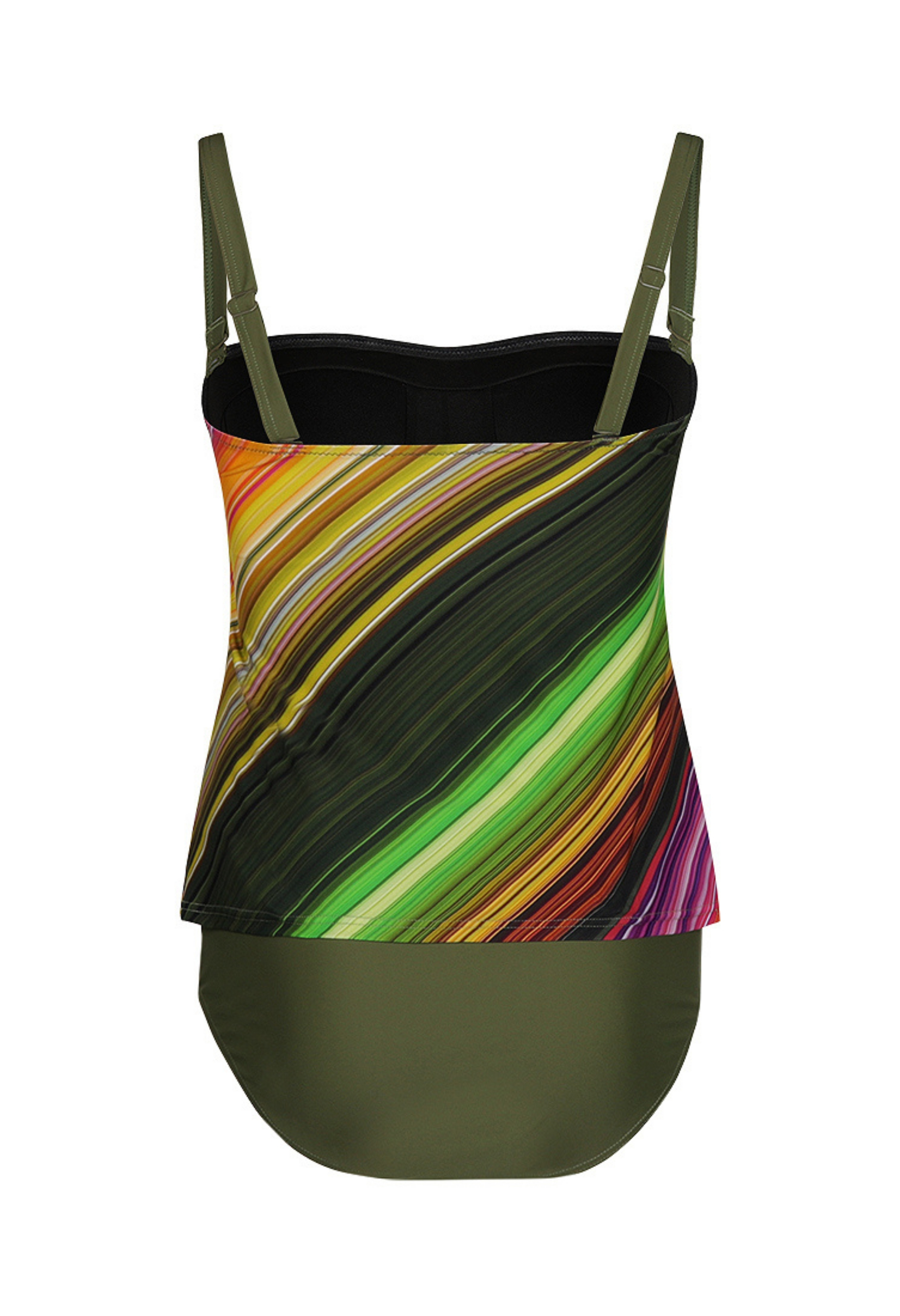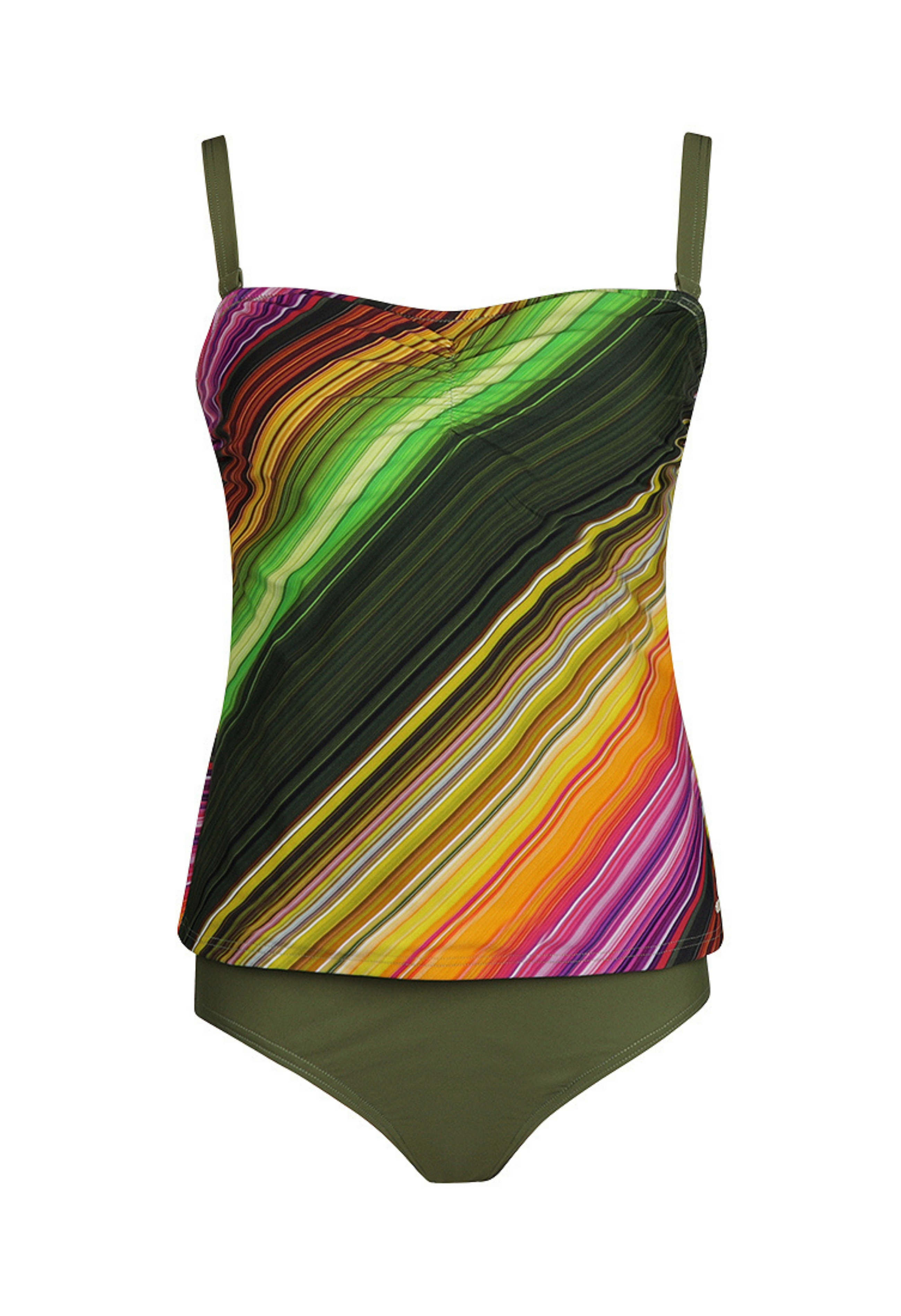 Deze tankini van Mila uit de zomercollectie is een stijlvolle en comfortabele keuze voor zonnige dagen. De top heeft een rechte halslijn met afneembare bandjes en kan ook strapless gedragen worden dankzij de goede pasvorm. Een subtiele gathering aan de voorkant zorgt voor een elegante uitstraling. De top is uitgevoerd in een uniek meerkleurig streepdessin, waarbij elk model net iets anders is: de ene variant bevat meer roze- en paarstinten, terwijl een andere juist groen- en geeltinten benadrukt. De effen olijfgroene bikini-slip vormt een rustige en verfijnde tegenhanger. Gemaakt van sneldrogend materiaal met comfortabele stretch ? perfect voor een kleurrijke en zelfverzekerde look aan het water.
