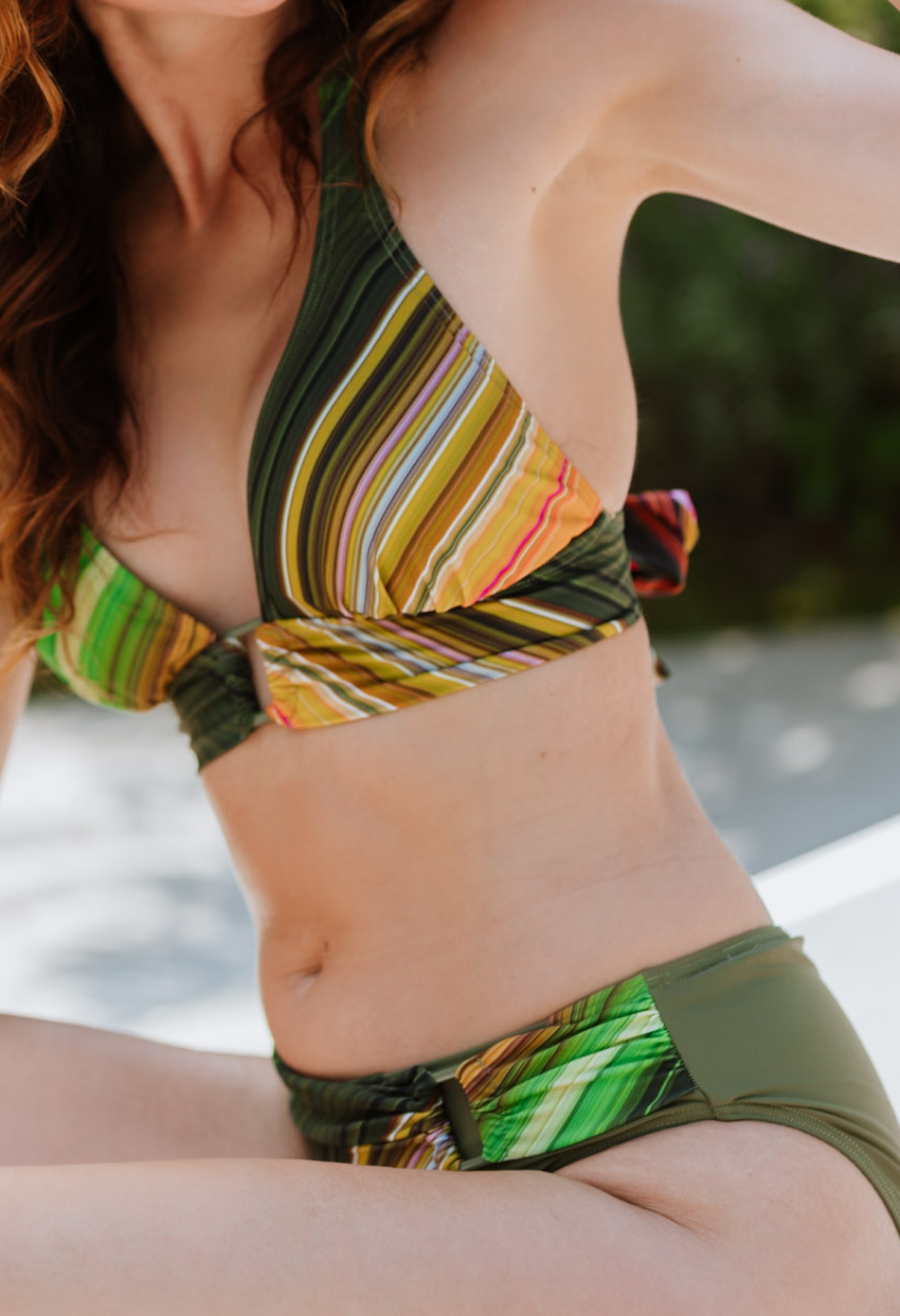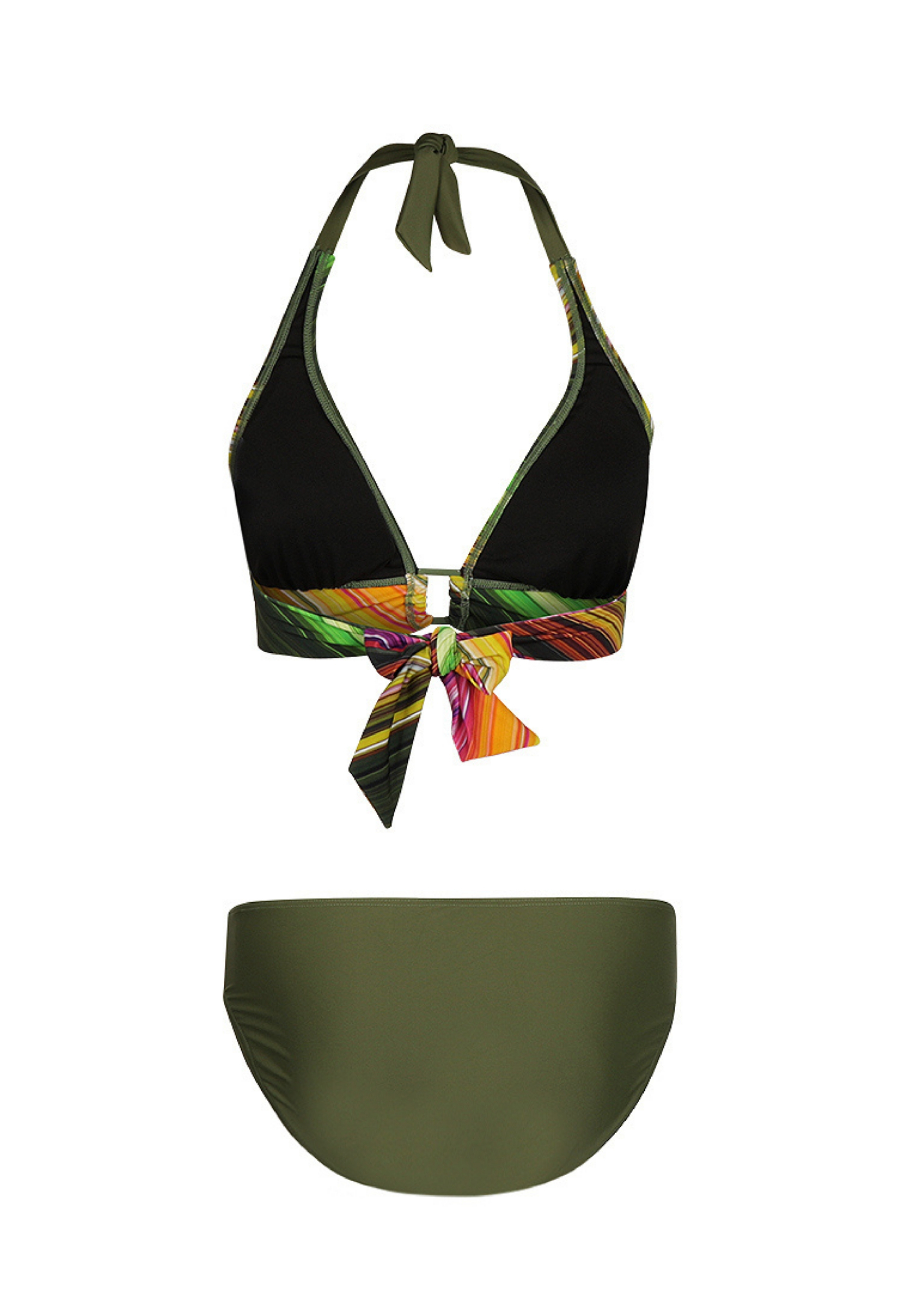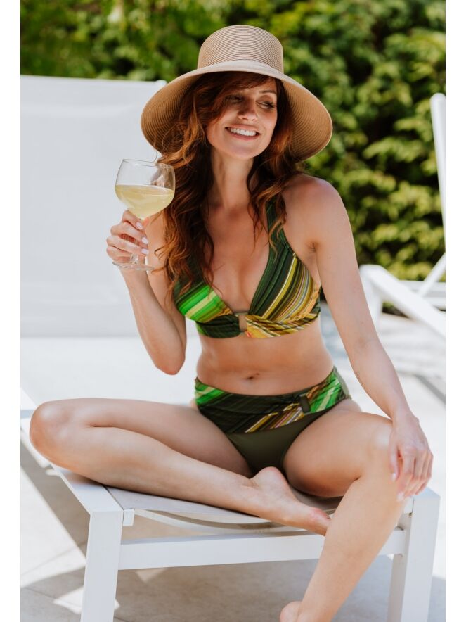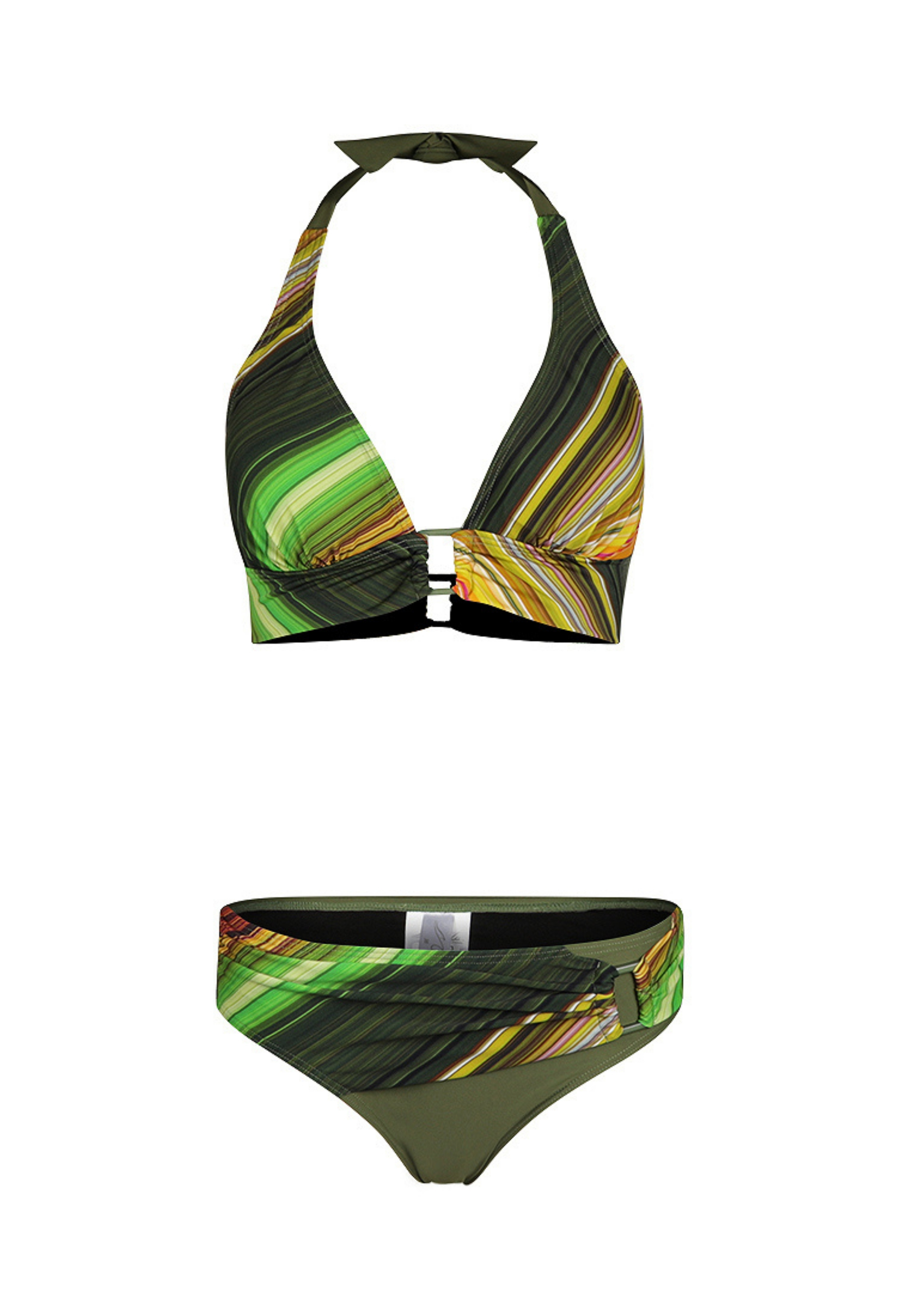 Deze halterbikini van Mila uit de zomercollectie is een echte blikvanger dankzij het meerkleurige streepdessin en het sierlijke buckle detail op zowel het topje als het broekje. Elke bikini is uniek: het ene model heeft meer roze- en paarstinten, terwijl een ander juist groen- en geeltinten benadrukt. Gemaakt van comfortabel, sneldrogend materiaal met stretch, ideaal voor een kleurrijke en stijlvolle dag aan het water.