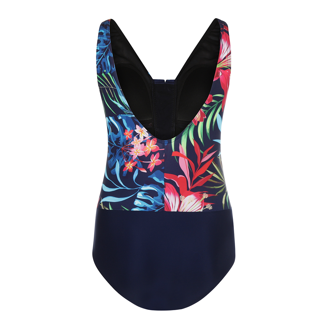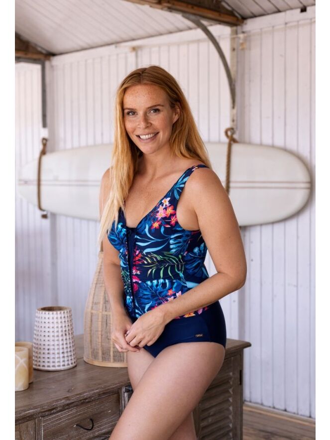 Dit badpak heeft een dubbele ruche die begint onder bij de buik en eindigt achter de schouder. Voor de buste is er een gevoerde binnentop ingezet. De rug heeft een middeldiepe U uitsparing.