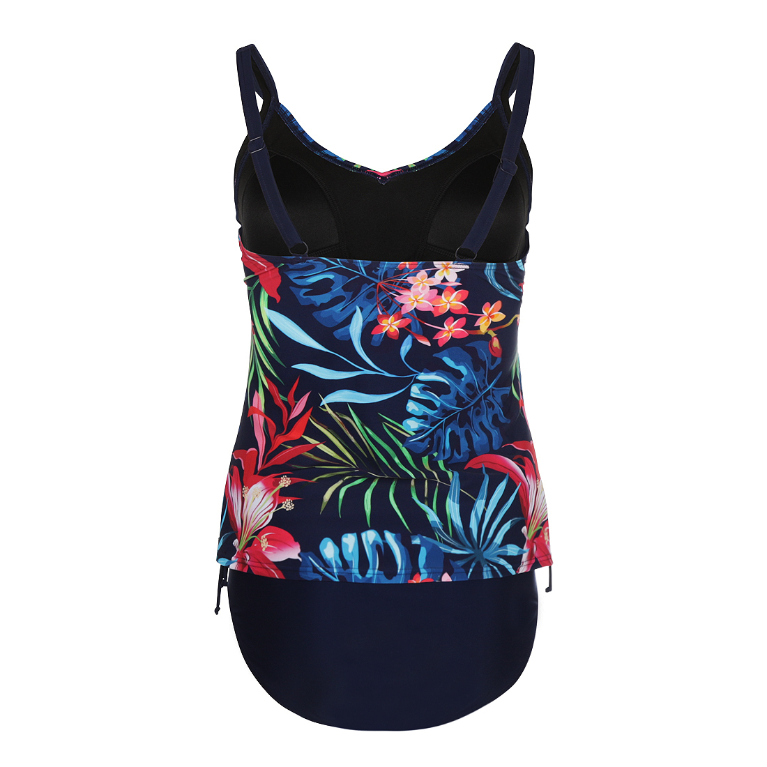 Deze tankini met verstelbare schouderbandjes en voorgevormde cups heeft een body met rimpeltjes die het silouet bekrachtigen. Het broekje heeft een brede omslag band met in de zij een koordje. De brede band kan ook naar boven gevouwen worden om er een hoger model broekje van te maken.