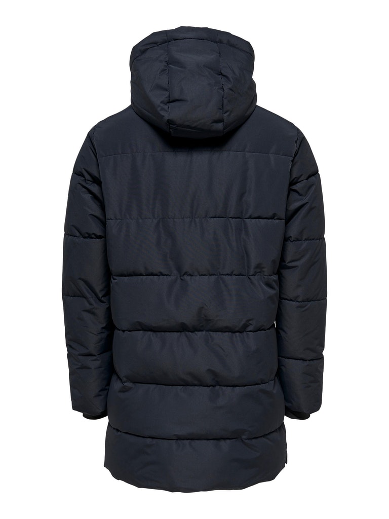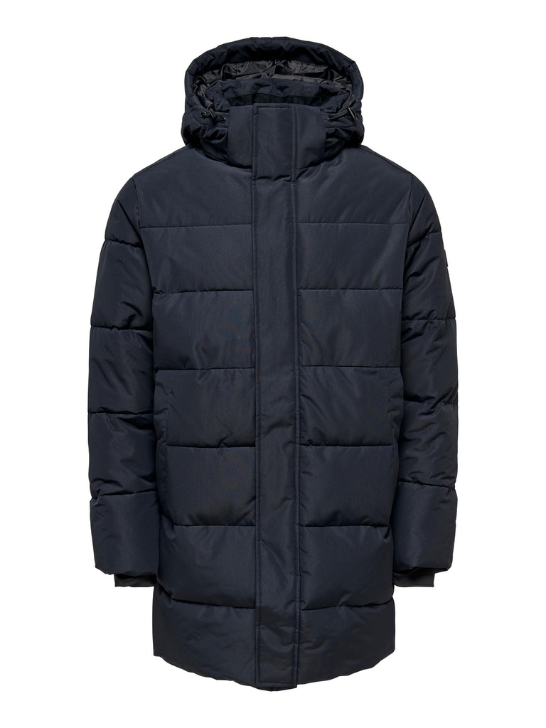 Lange winterjas van Only Aand Sons. De jas heeft een lang puffer model met een afneembare capuchon. Waterproof. De zijkanten kunnen open.