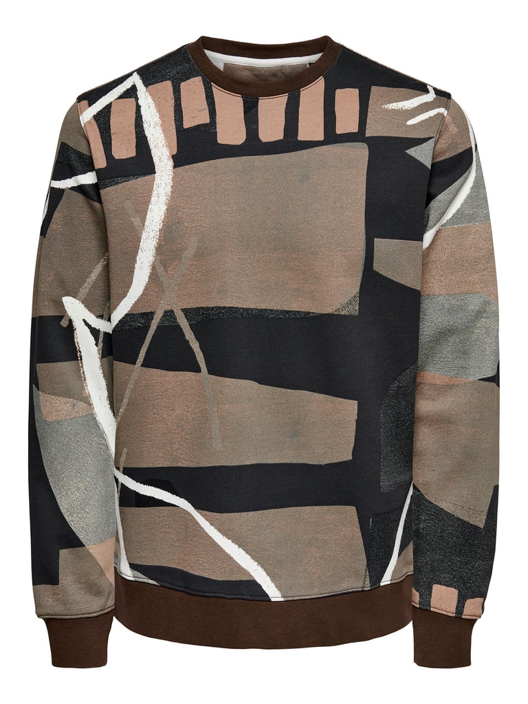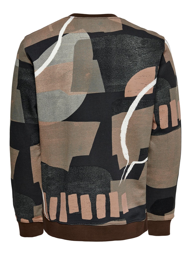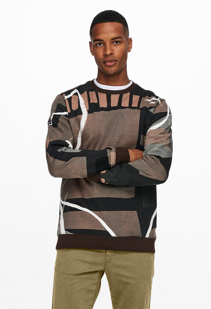 Trui van Only and Sons. De trui heeft een all over print, de print is op elke trui iets anders geprint. De trui is van dunne sweater stof. Materiaal: 100% katoen. Wassen op 30 graden, niet bleken, niet in de droger, kan gestreken worden.