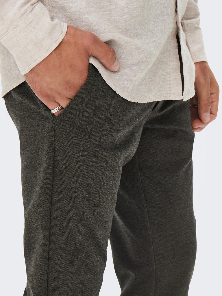 Deze nette heren pantalon met fijn vissengraat patroon is een slim fit model. Steek je handen heerlijk nonchalant in de steekzakken. Achterop zitten twee paspelzakken. Combineer het met een net overhemd of met een fijne sweater. De OnsMark broeken van Only & Sons zijn tijdloos en classy.