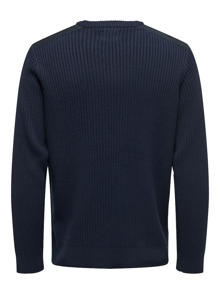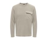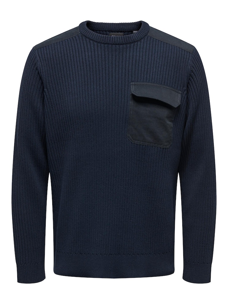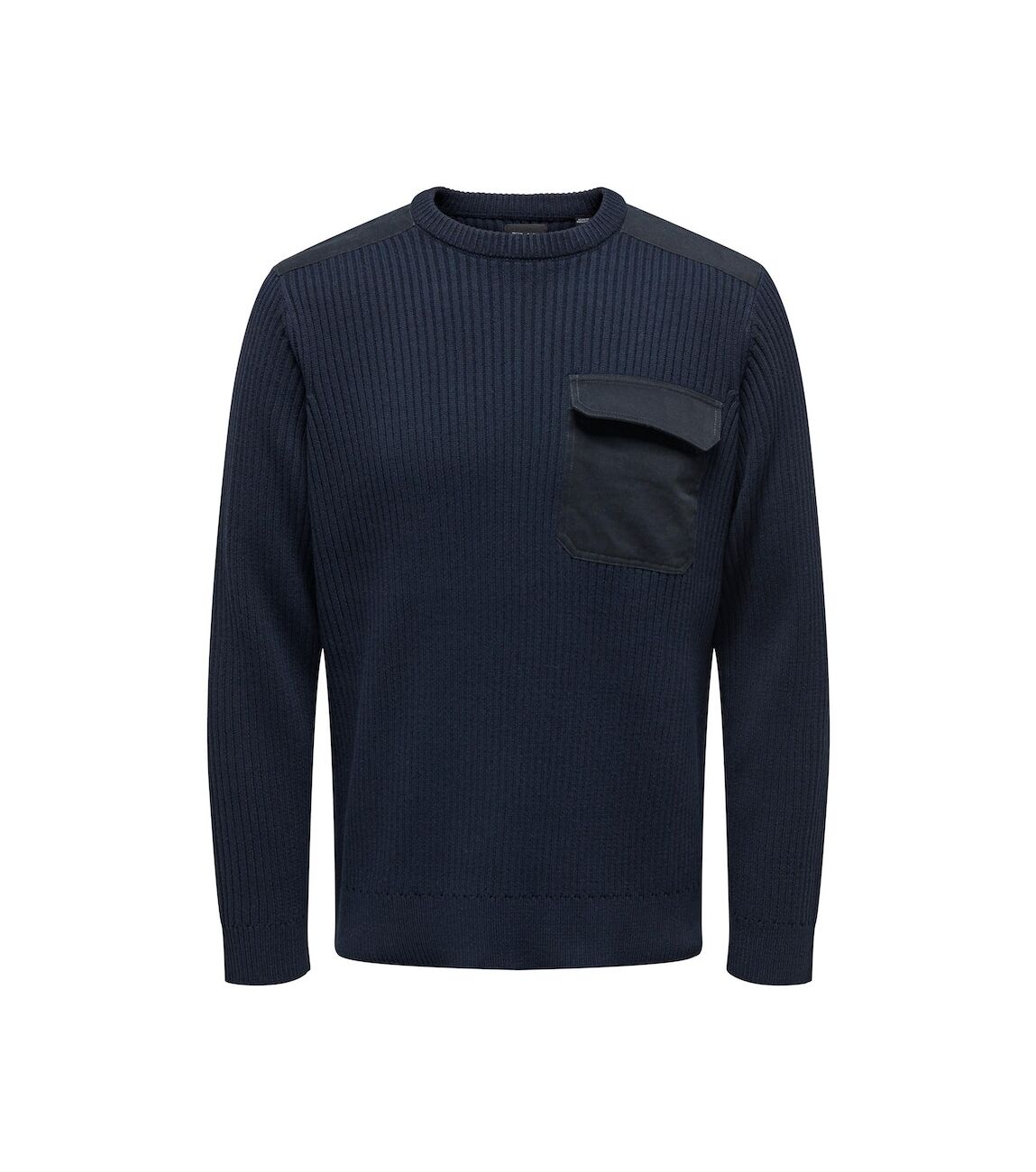 Herentrui met ribbreipatroon en een ronde hals. Op de linker borst zit een klepzak. Deze trui is gemaakt van gerecycled katoen.